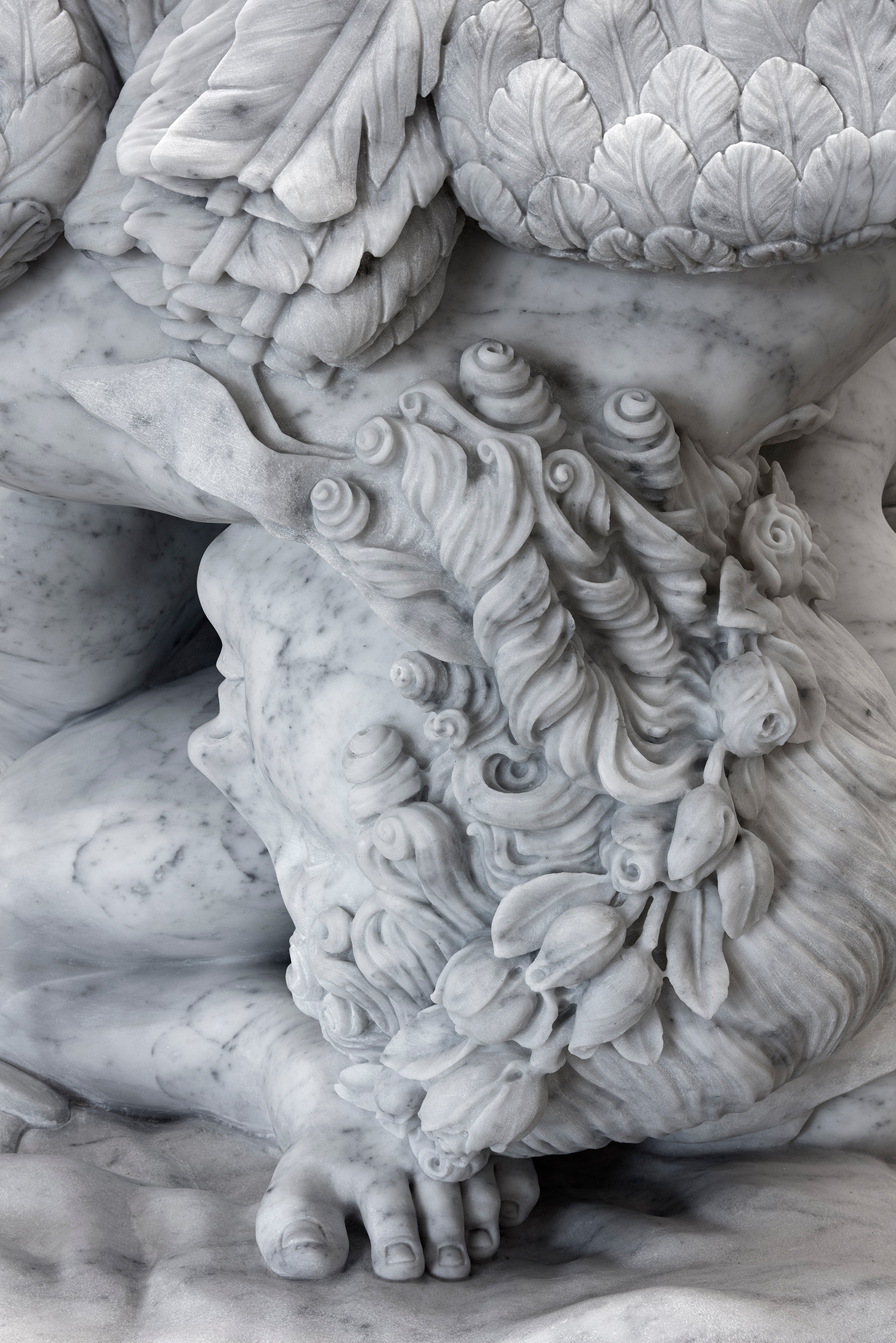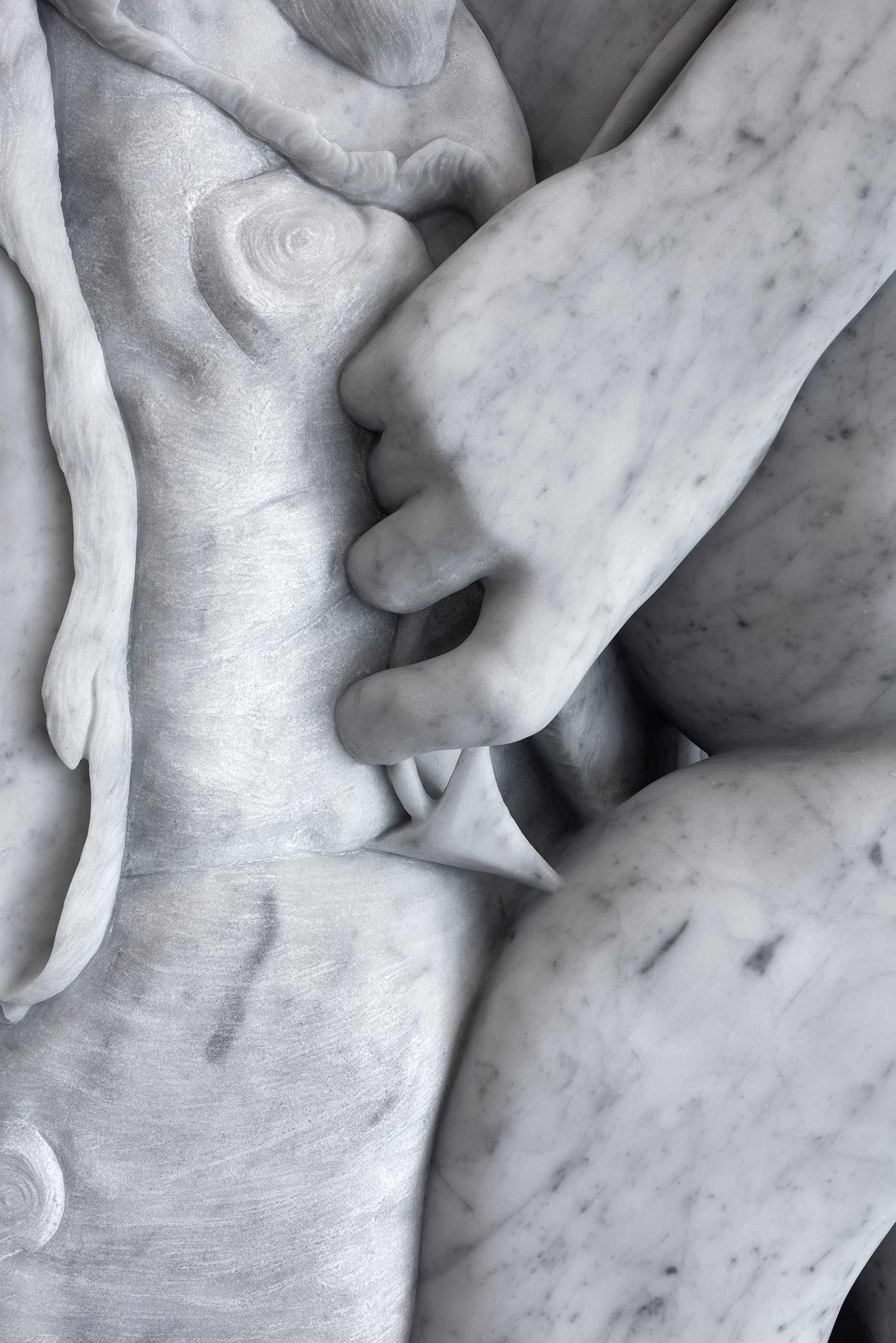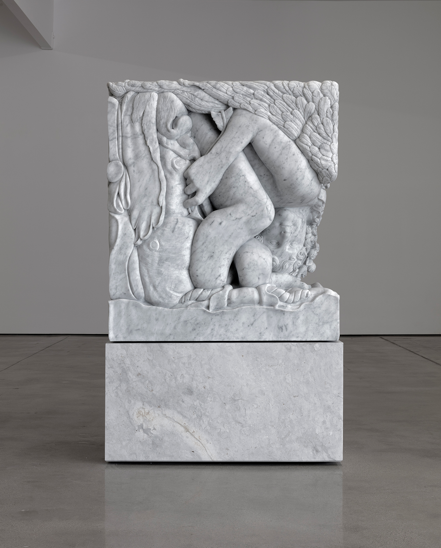 For this series, Adam Parker Smith - working with a team of master carvers, a seven-axis reductive robot, and the digital research teams at museums like the Uffizi - rendered original Hellenic and Romantic-era sculptures in 3D modeling programs before digitally compressing each of them into a compact cube, then painstakingly chiseled out of a Carrara marble block. The ancient stone draws a material through-line between the sculpture Smith has chosen for his homage, the better to defamiliarize these paradigmatic works as they appear before the viewer, radically reshaped.