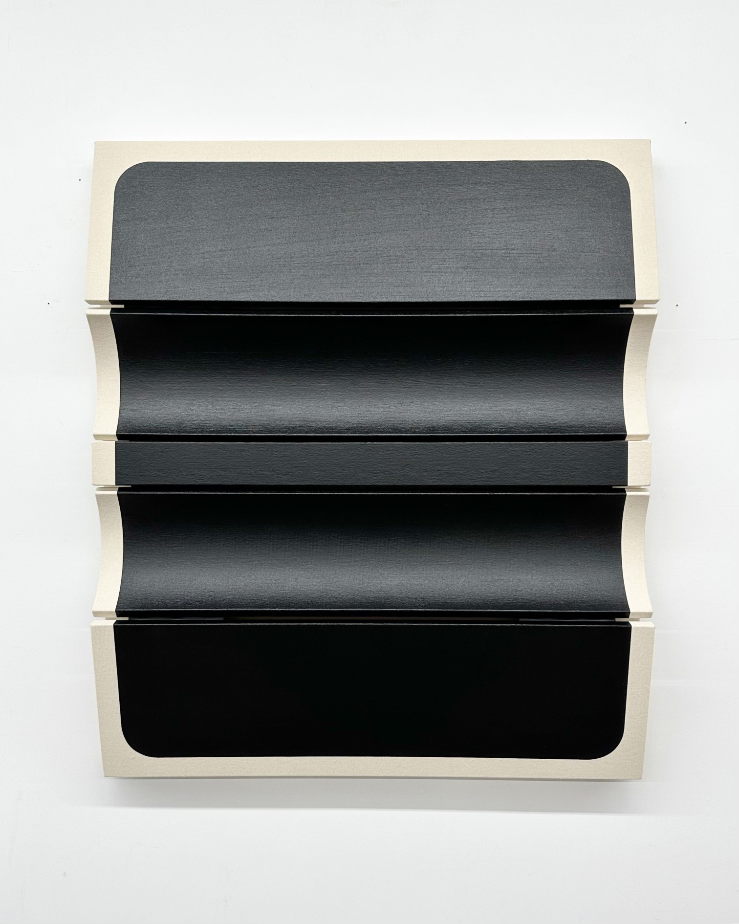 Robert Moreland, Blunted Black Rectangle, 2023, Drop cloth on wooden panel with acrylic paint, tacks and leather hinges, 42 x 36 x 4.5 inches, 107 x 91.5 x 11.5 cm.