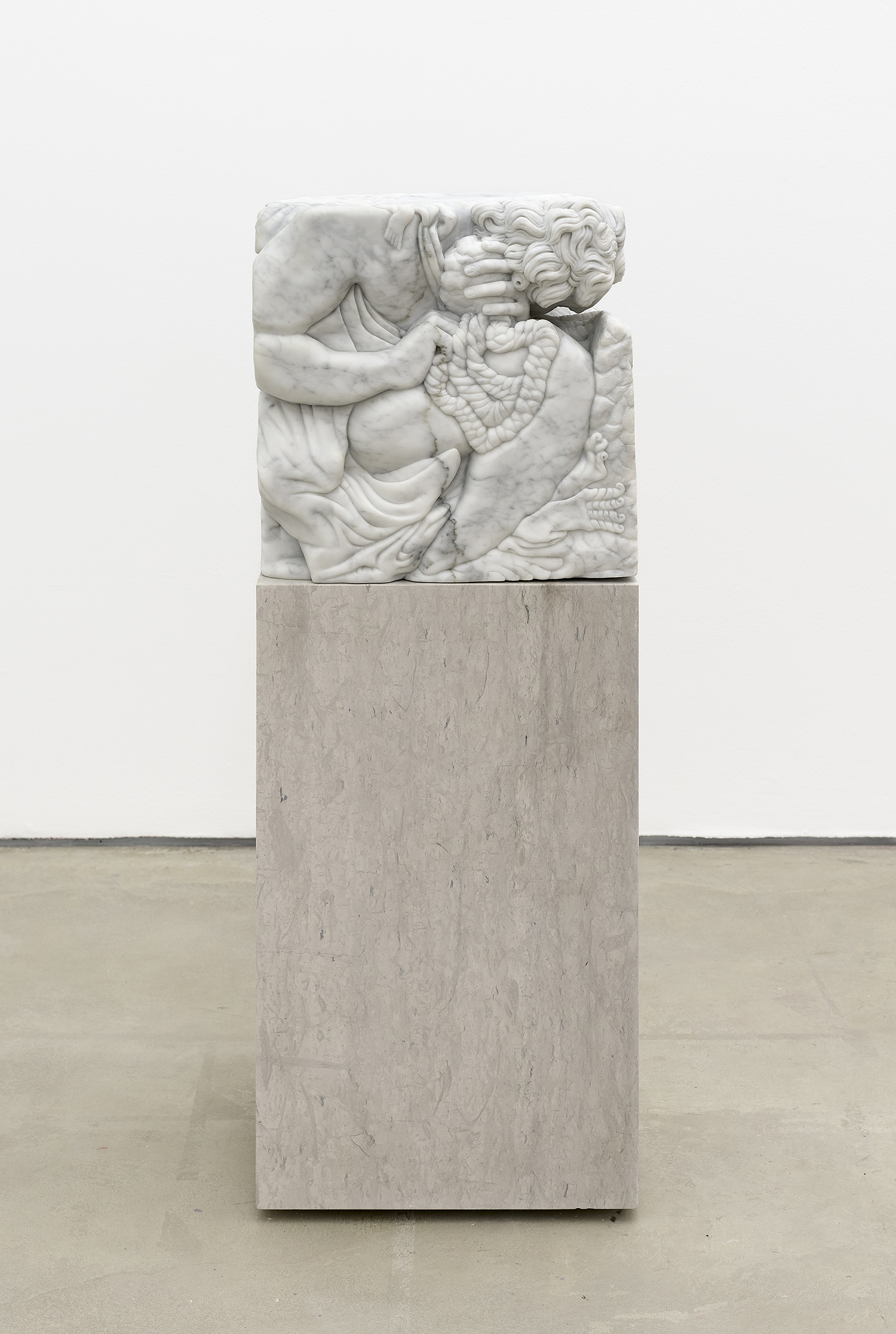 Adam Parker Smith, David, 2023, White Carrara marble on stone pedestal, 75 x 23.5 x 26.5 inches, 190 x 60 x 68 cm.
