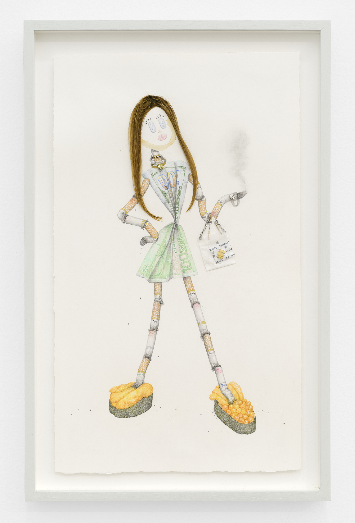 Aurel Schmidt, Trash Doll (Uni), 2023, Color pencil, acrylic, shellac, diet coke, human hair, Swarovski Crystals, metal chains, baking soda & drug bags on paper, 20 x 12 inches, 51 x 30 cm.