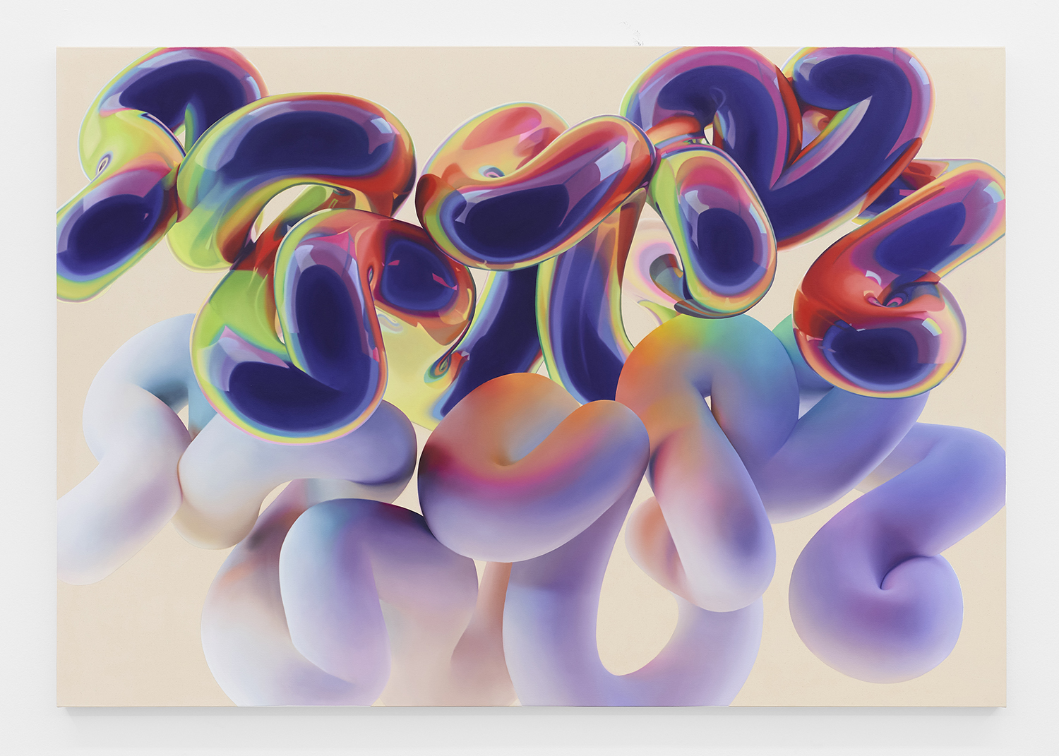 Maya Fuji, Meeting Place, 2022, Acrylic & airbrush on wood panel, 36 x 48 inches, 91 x 121 cm.
