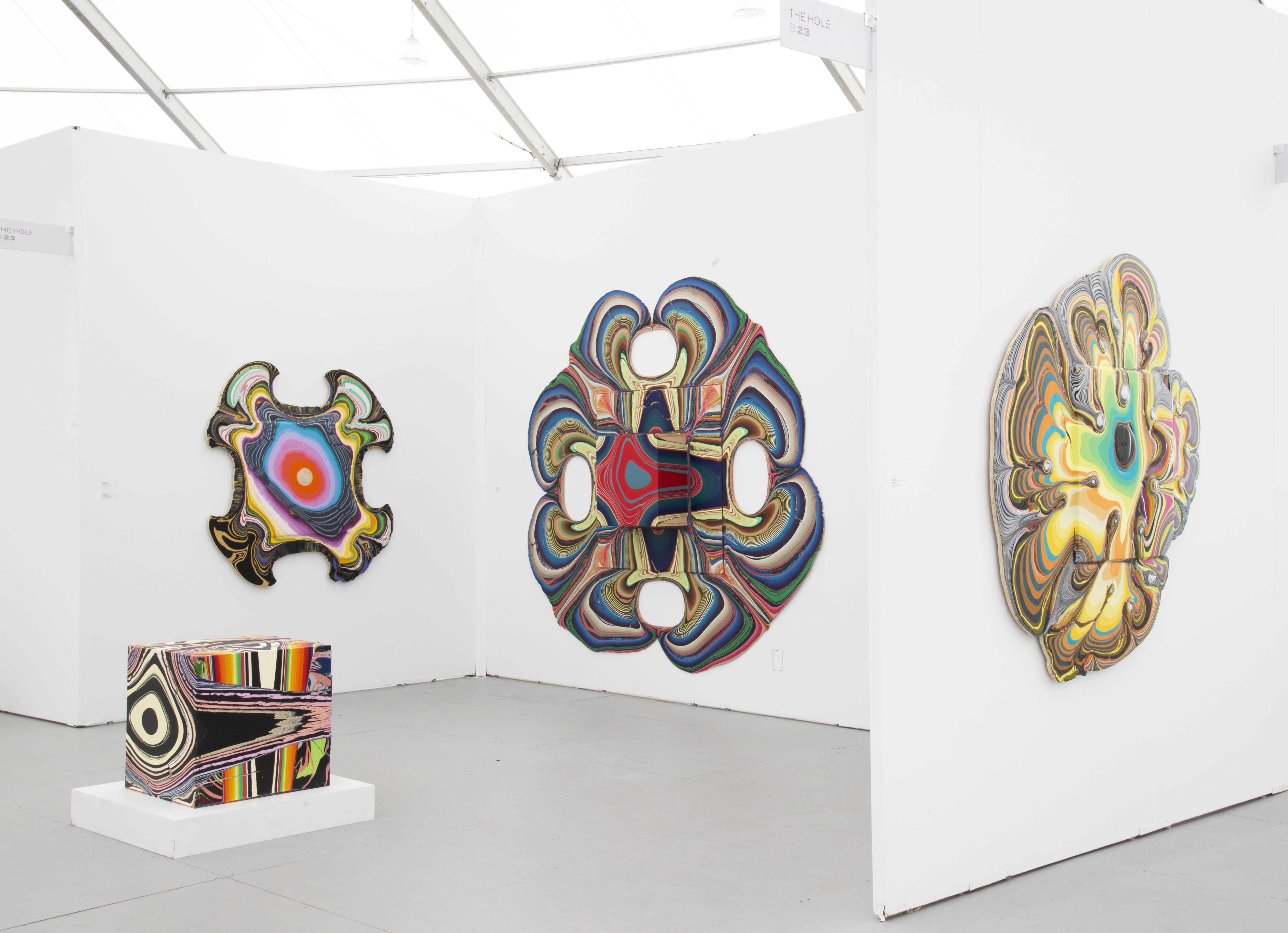 The Hole is proud to participate in the brand new UNTITLED Art Fair this December in Miami Beach. This is the first art fair to be held directly on the sands of Miami Beach in a beautifully designed tent on the beach at 12th Street. This fair is a curated exhibition of fifty solo or two-artist presentations, and our artist Holton Rower was selected by curator Oscar Lopez-Chahoud to present a solo project of new pour paintings and a pour cube (pictured above). These new pieces are fresh from the studio and incorporate the mettalic and opalescent paints of the large-scale pieces from our May solo exhibition, but in a smaller size and on a contiguous wood panel. The paintings range in size from five to eight feet.