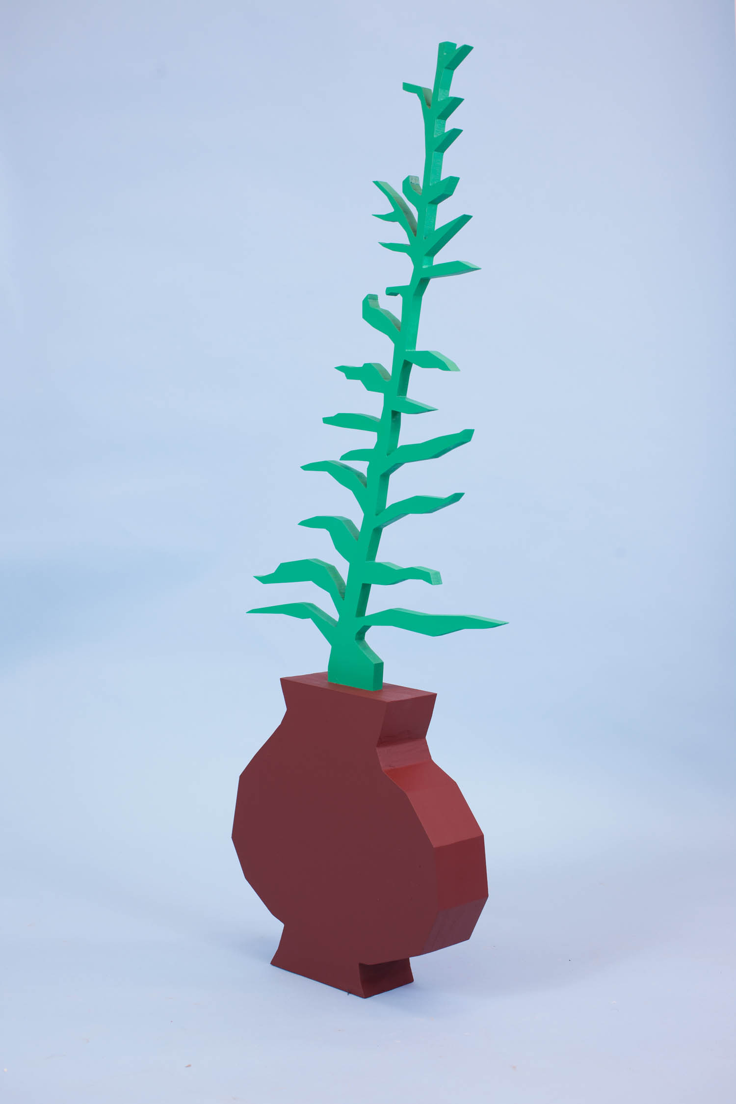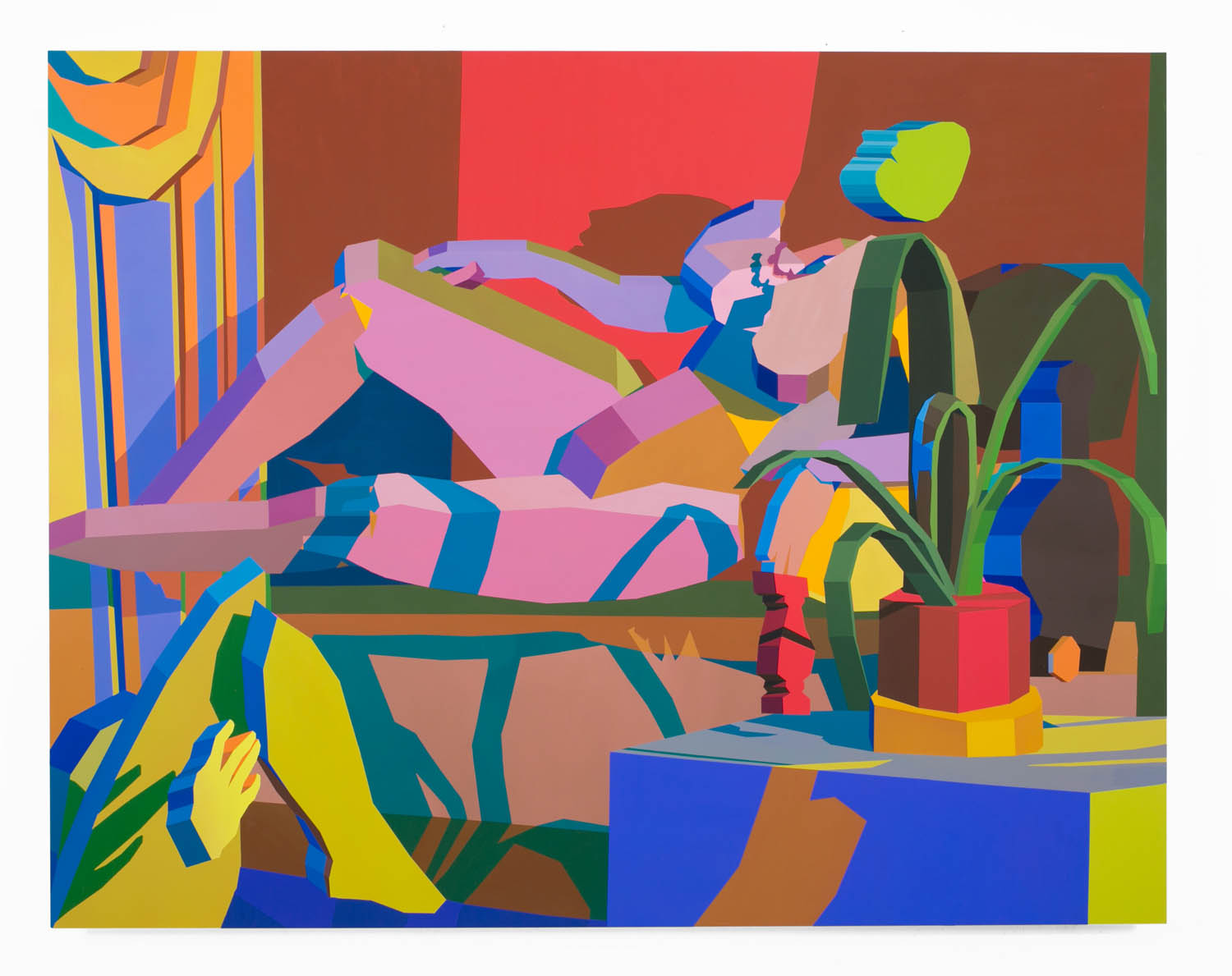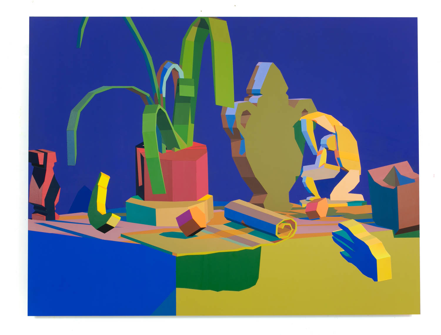 The paintings on panel seem chiseled into existence along strict perspectival planes, à la Mernet Larsen or Avery Singer, a digital imaging style evolved from 3D rendering programs. The visual absurdity of rendering in clunky, wooden 3D a fern, a banana or a human breast is part of the humor of the works, whereas the moody palette and narrow tonal range give a more surrealist edge to the scenes.