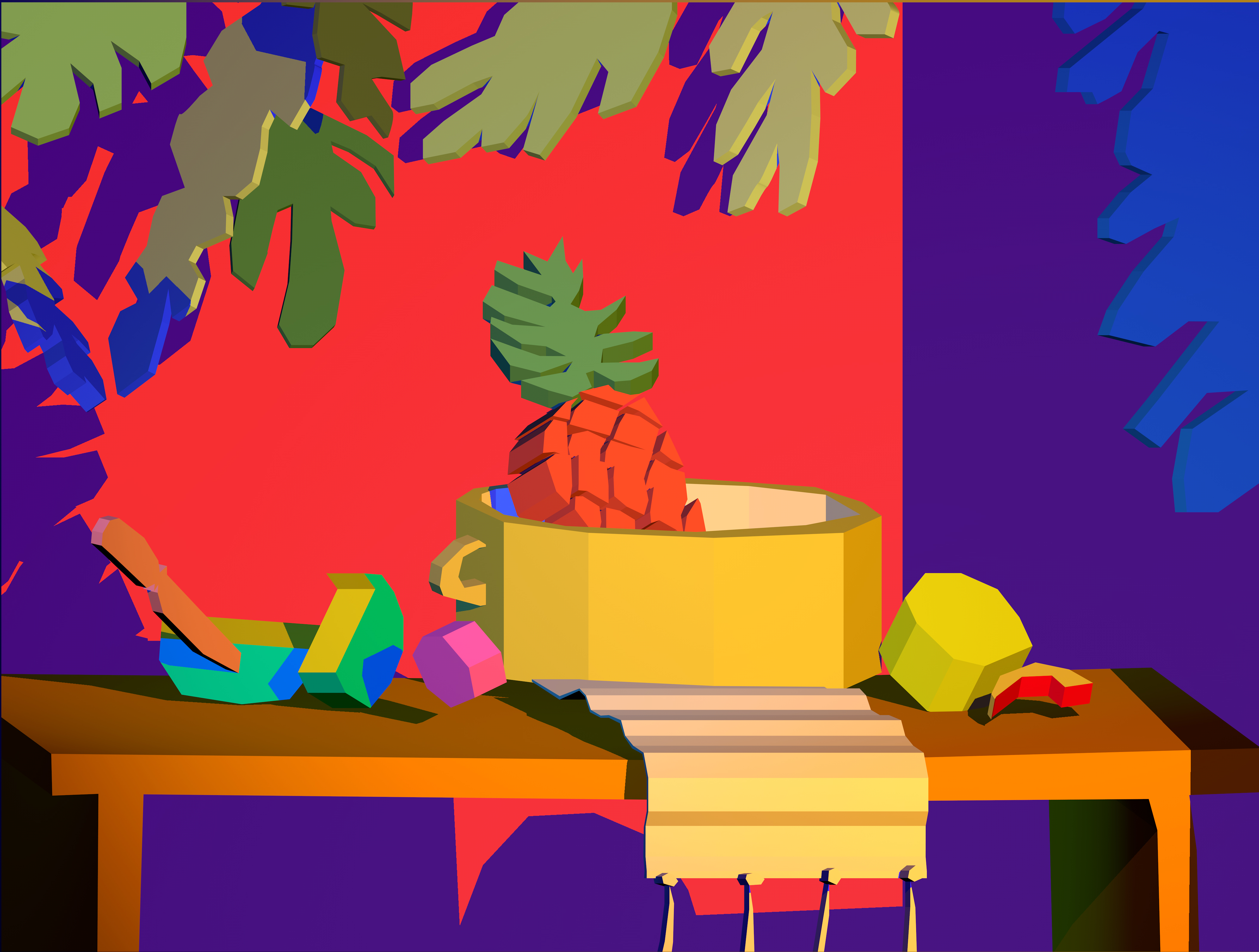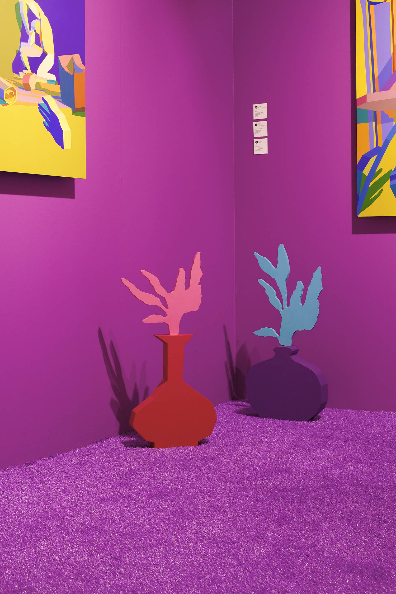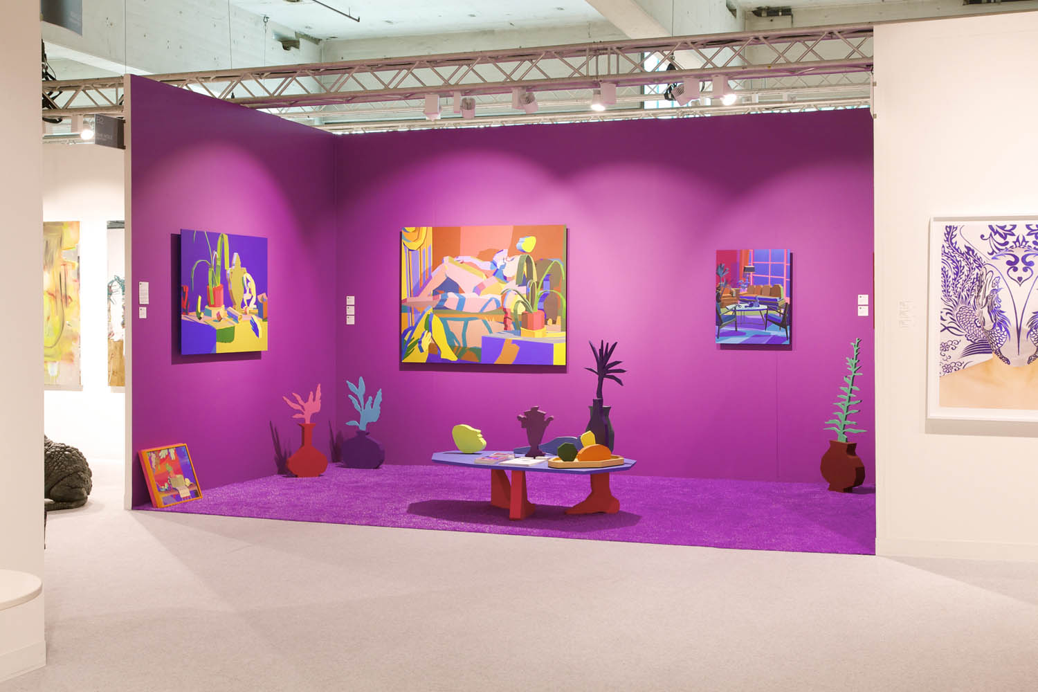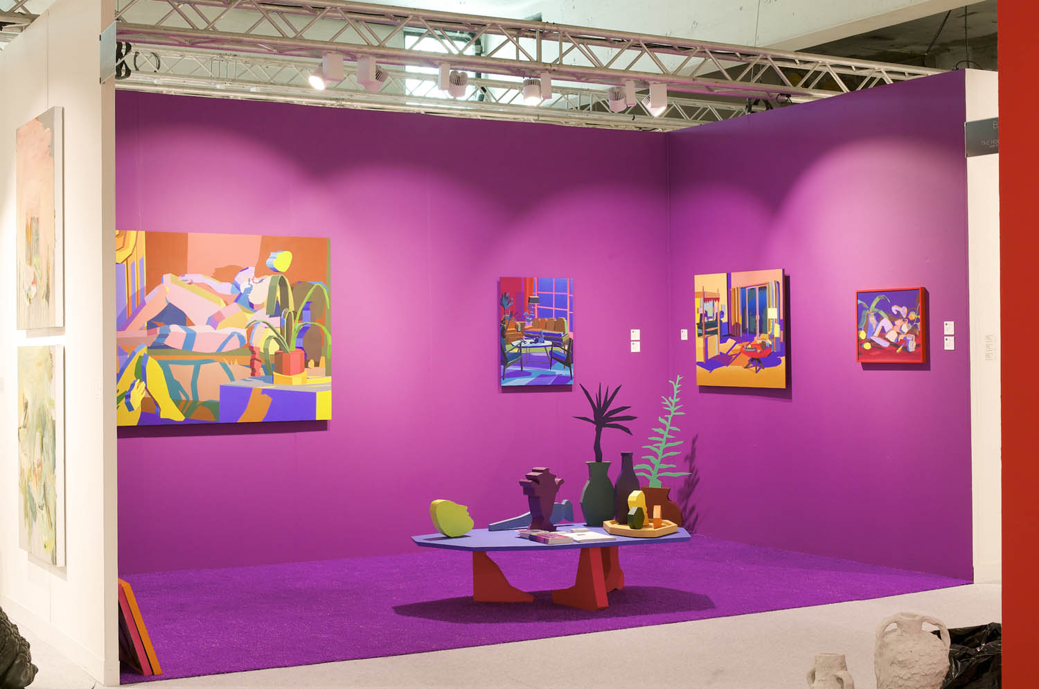 Pulling items out of the paintings and into the booth installation, Chapline executes a table of objects and three potted plants with CNC routed MDF sculpture in the same 2D-3D way. Visitors can experience the virtual space of his painted world by entering this violet environment.