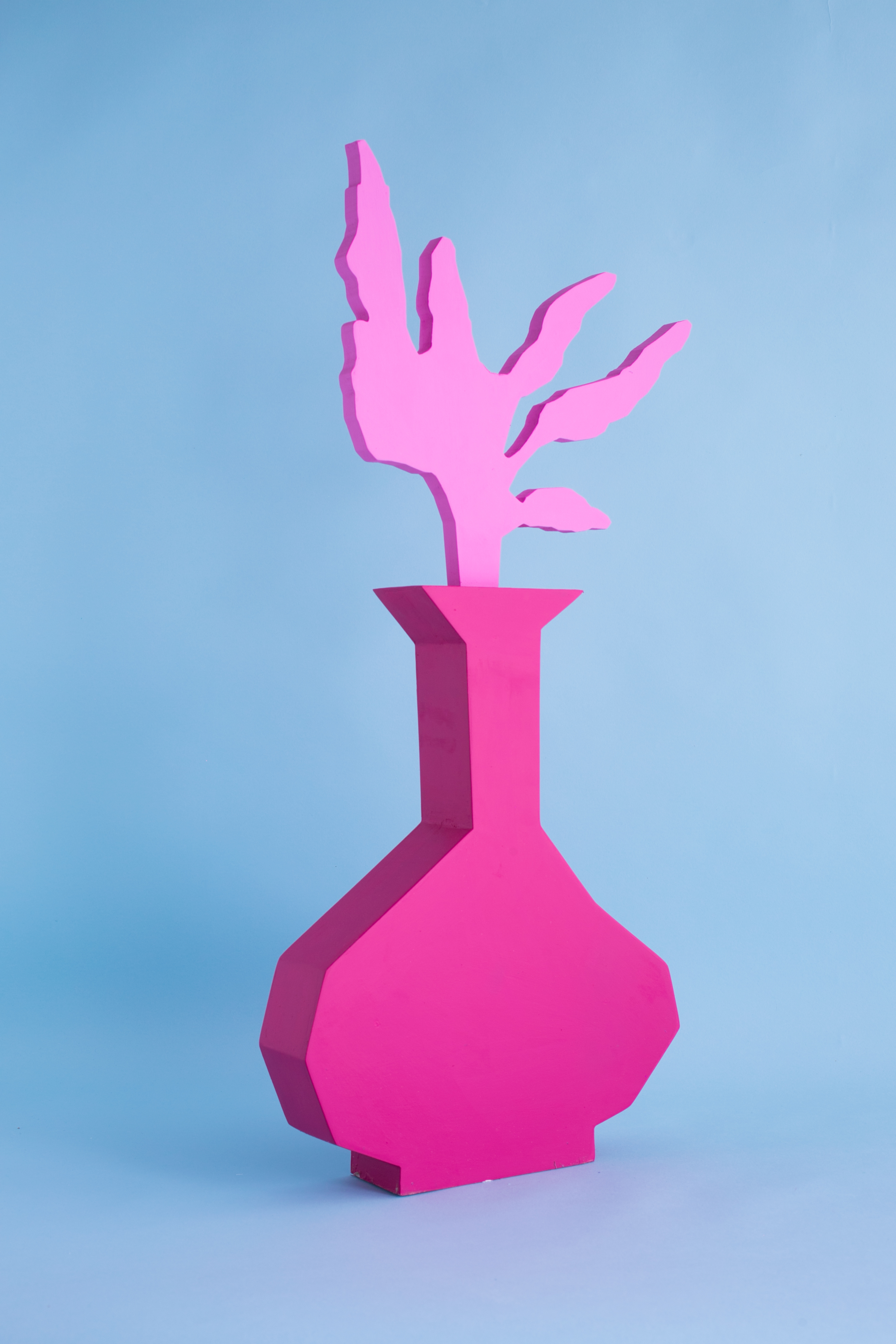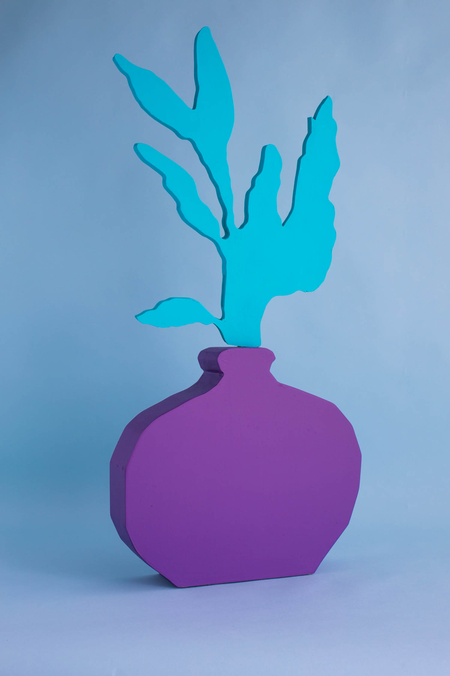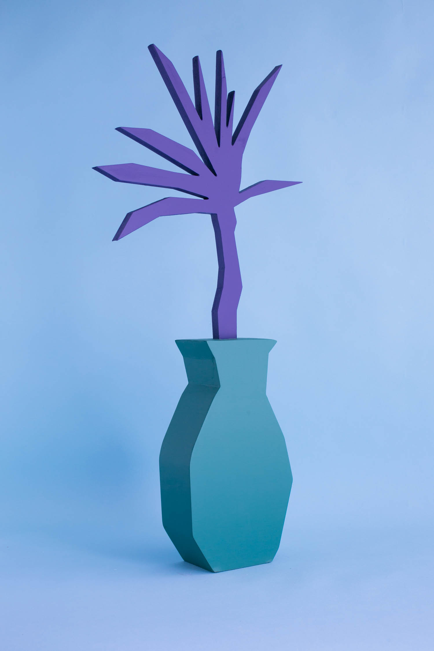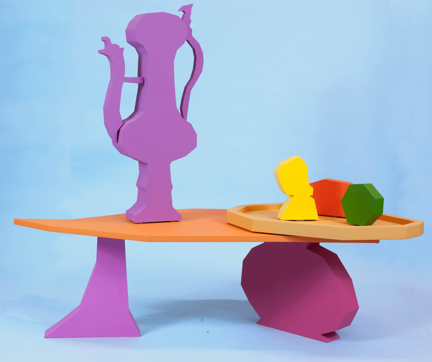 Pulling items out of the paintings and into the booth installation, Chapline executes a table of objects and three potted plants with CNC routed MDF sculpture in the same 2D-3D way. Visitors can experience the virtual space of his painted world by entering this violet environment.