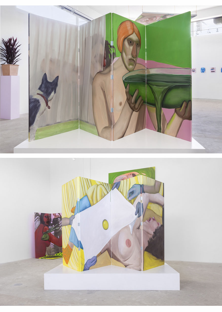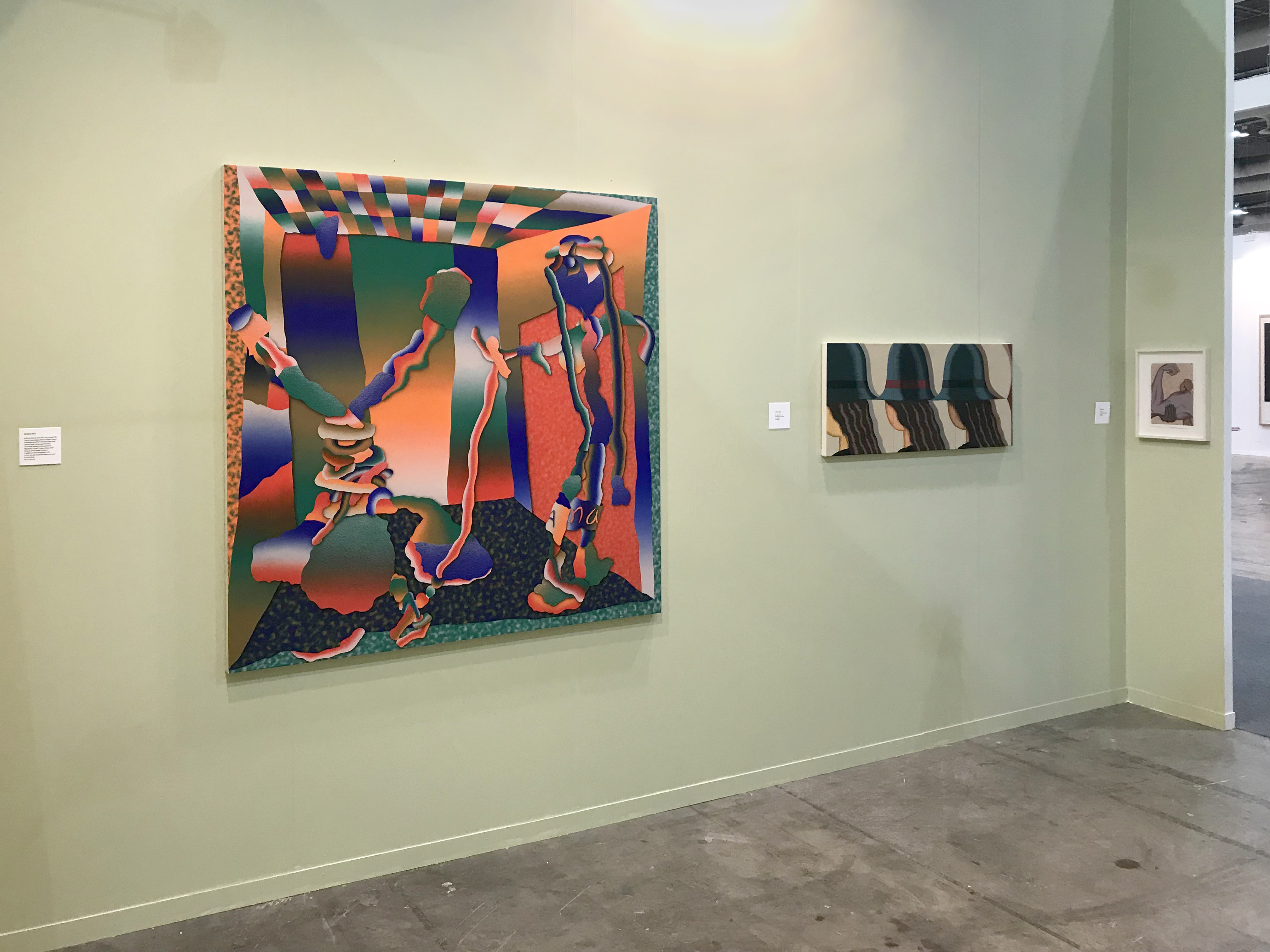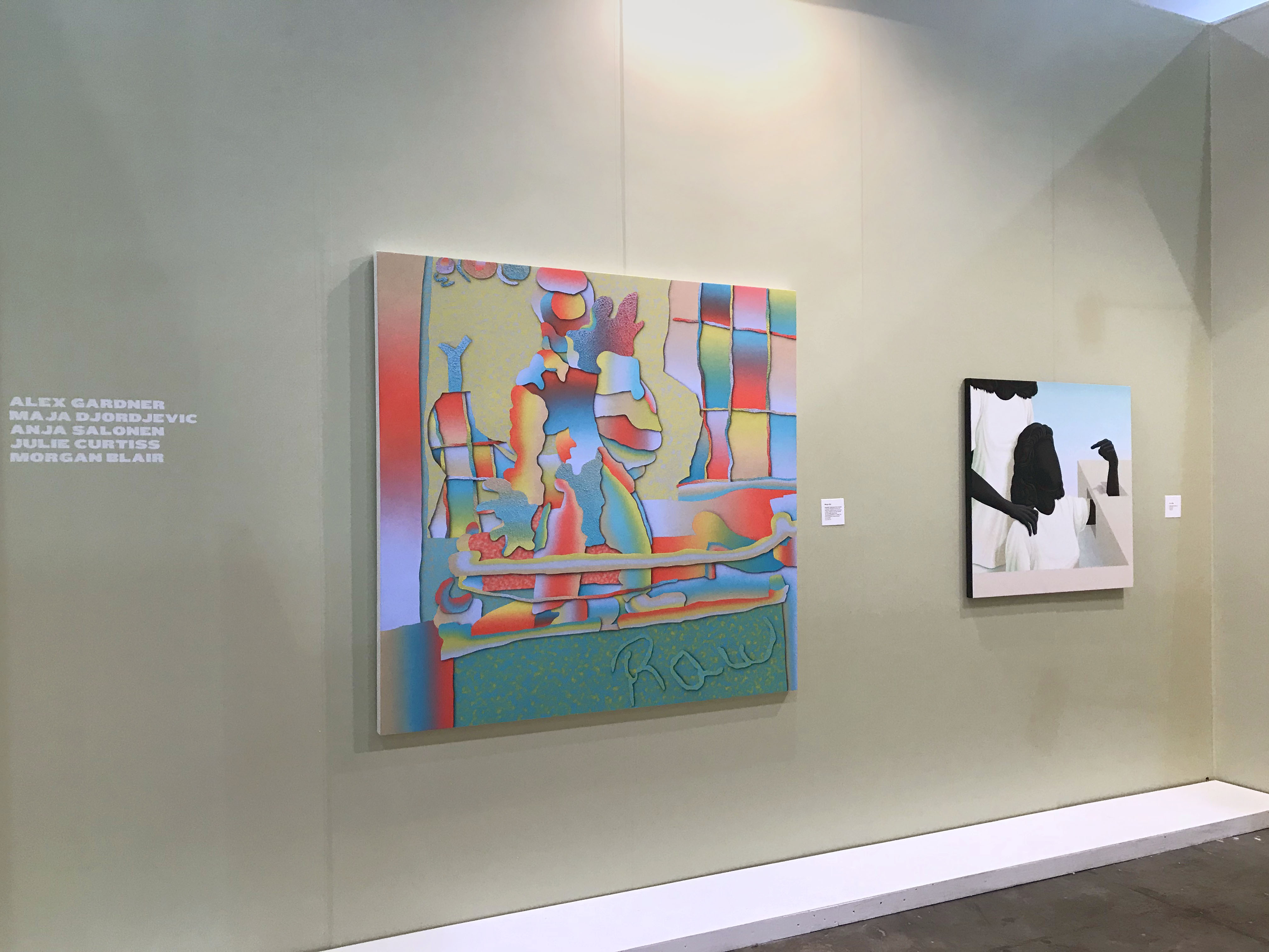The Hole is very excited to participate in ZONA MACO for the first time, presenting a group booth of young artists working with Surrealist strategies. From the eerily repeated women in Julie Curtiss' triptych to the naked and screaming women painted by Belgrade-based Maja Djordjevic, the female form is also a through-line. Alex Gardner paints an unsettling but lovely scene of two women pointing, Anja Salonen exhibits a two-sided screen painting and a new canvas of a slumbering boulder lady, while Morgan Blair contributes three new airbrush and pumice works, blurred and abstracted, depicting perhaps some breakdancers and at least one "RAW" wrester.