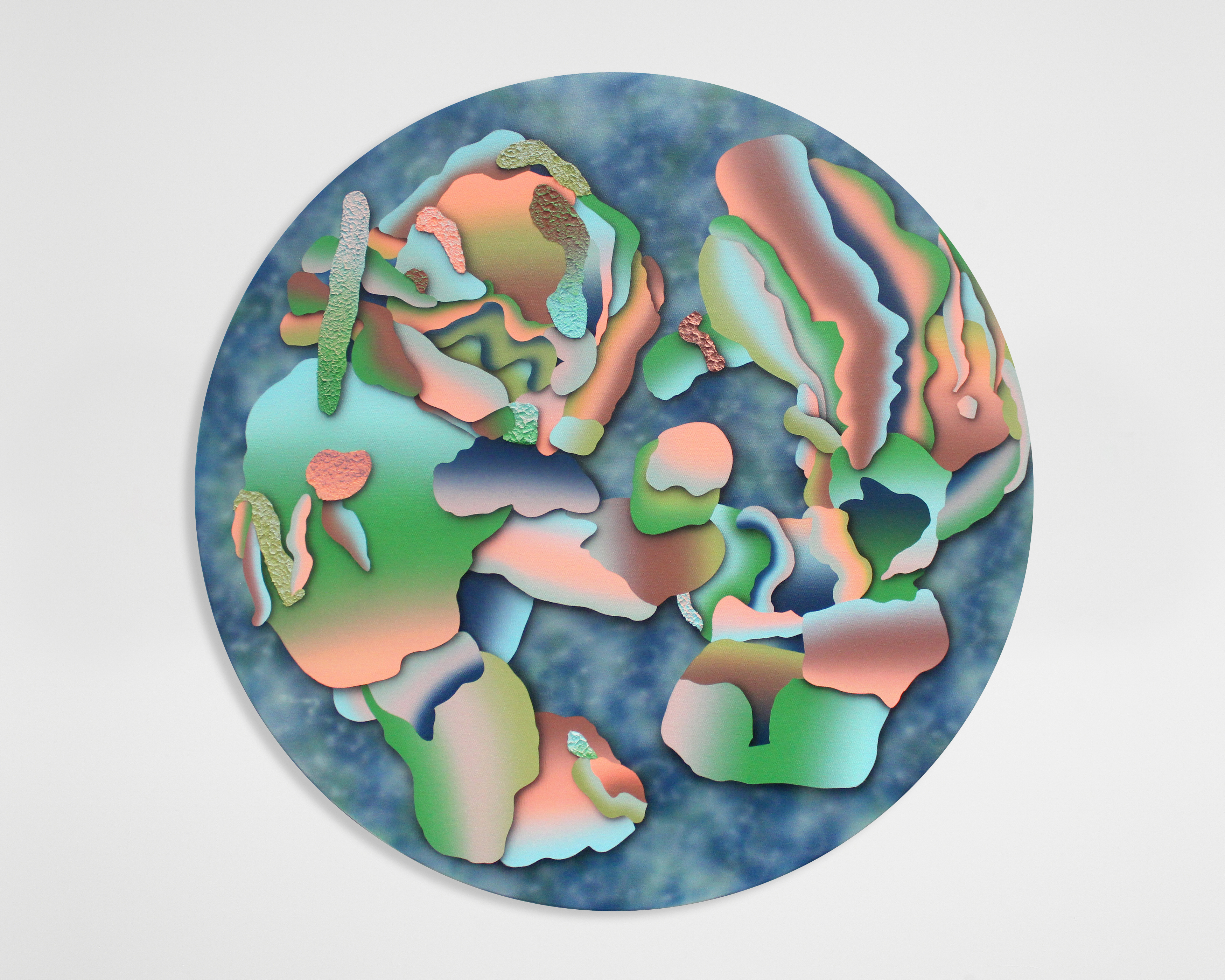 Morgan Blair, Like, Yes, I Get It, And I'm Not Sympathizing With Him, But How Does He Deserve To Have The Entire Contents of His 20,000 Square Foot Key Chain Hand Sanitizer Museum Repossessed, Dumped Alongside The Freeway, And Potentially Crushed Under The Weight of 100 Buffalo Stampeding Towards The Last Remaining Chick-Fil-A? Just Seems Unfair, Like Where's The Line?, 2018, Acrylic and pumice gel on canvas over panel, 30 inches diameter, 76 cm diameter