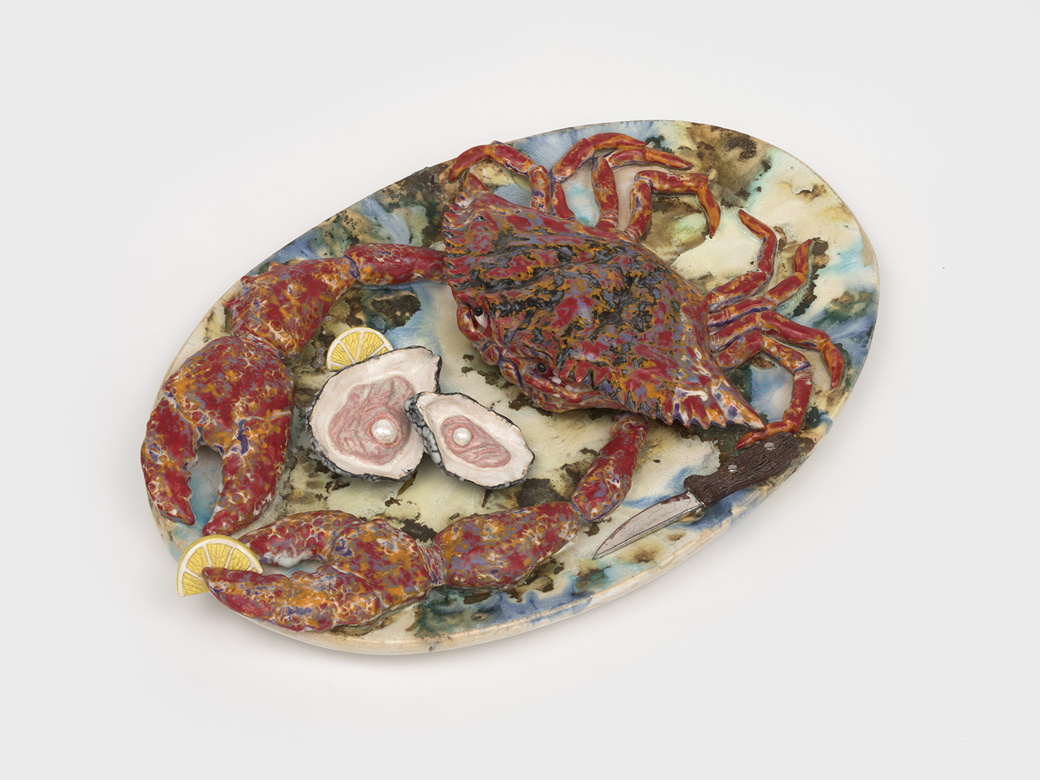 Roxanne Jackson, Crab Dinner, 2024, Ceramic, glaze, underglaze, luster, 22.5 x 15 x 3 inches, 57 x 38 x 8 cm.