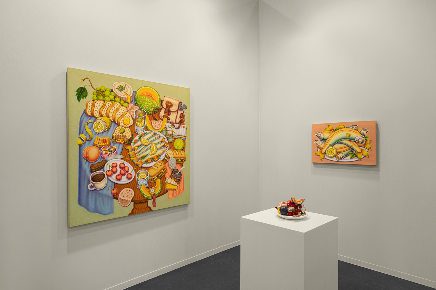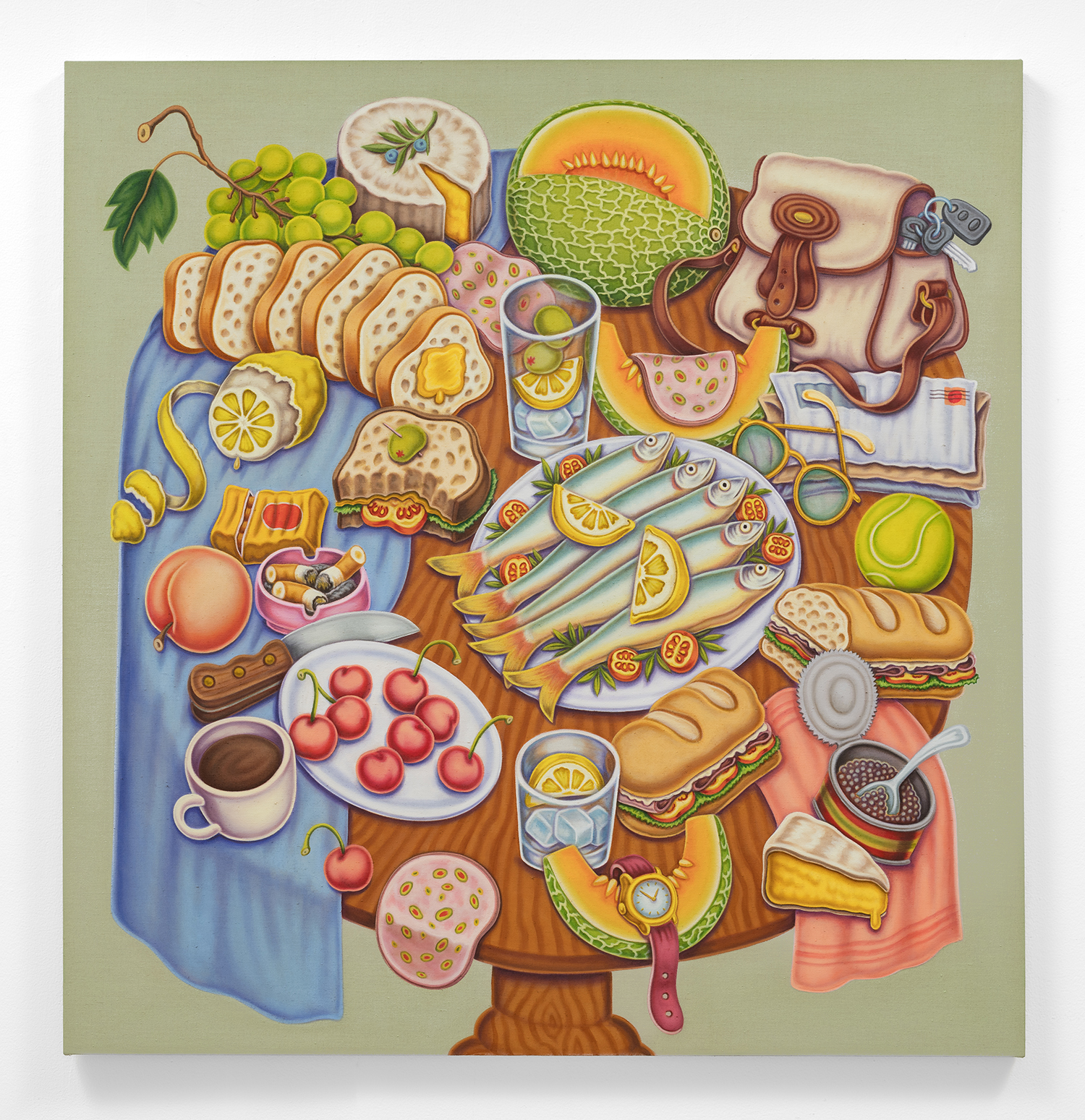 Pedro Pedro, Table with Purse, Melon, Fish and Cherries, 2023, Textile paint on linen, 36 x 48 inches, 91 x 122 cm.