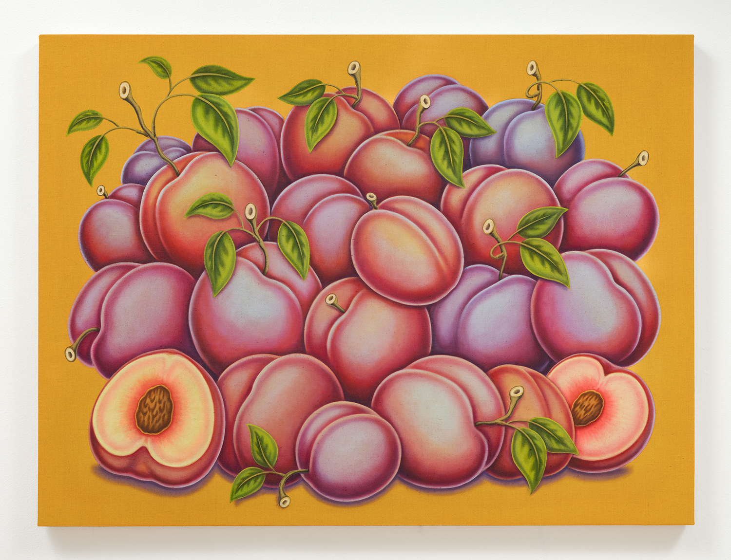 Pedro Pedro, Pile of Plums, 2023, textile paint on linen, 36 x 48 inches, 91 x 122 cm.