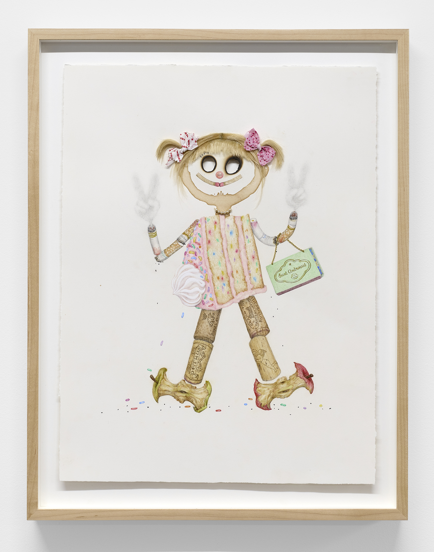 Aurel Schmidt, Trash Doll (Sant Ambroeus), 2024, Color pencil, pastel, acrylic, human hair, chain, faux pearls, candy wrappers, archival glue and burn holes on paper, unframed dimensions: 18 x 13 inches, 43 x 32 cm. Framed dimensions: 21 x 16.25 inches, 53 x 41 cm.