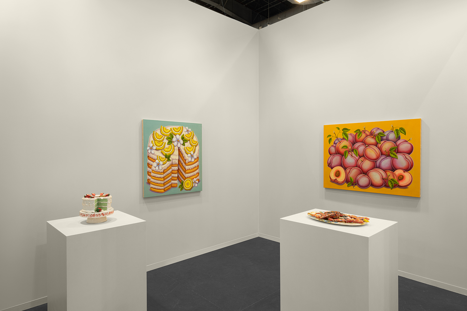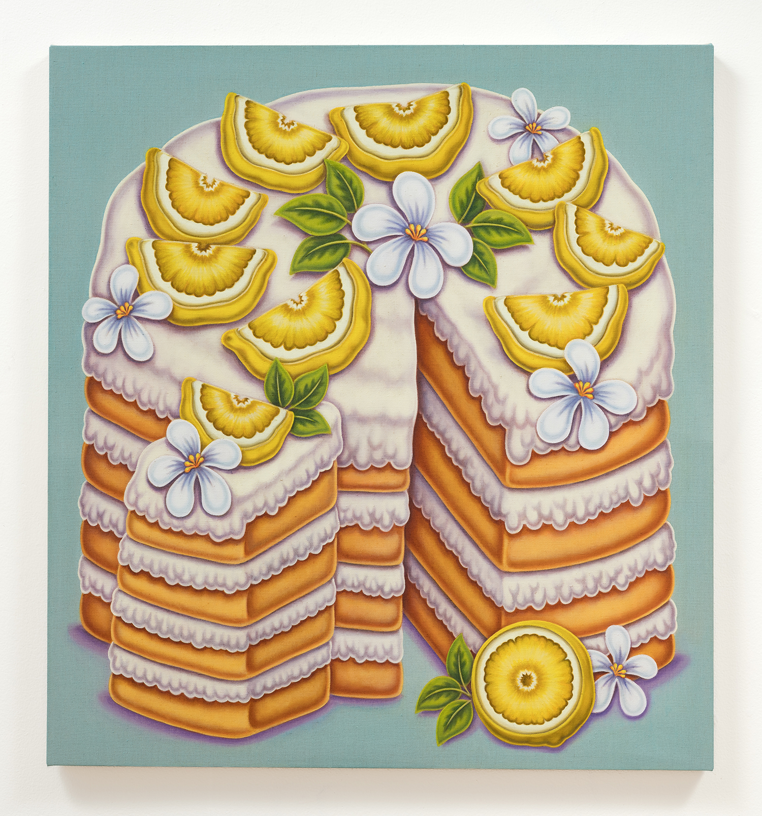 Pedro Pedro, Lemon Cake, 2023, Textile paint on linen, 39 x 36 inches, 99 x 92 cm.