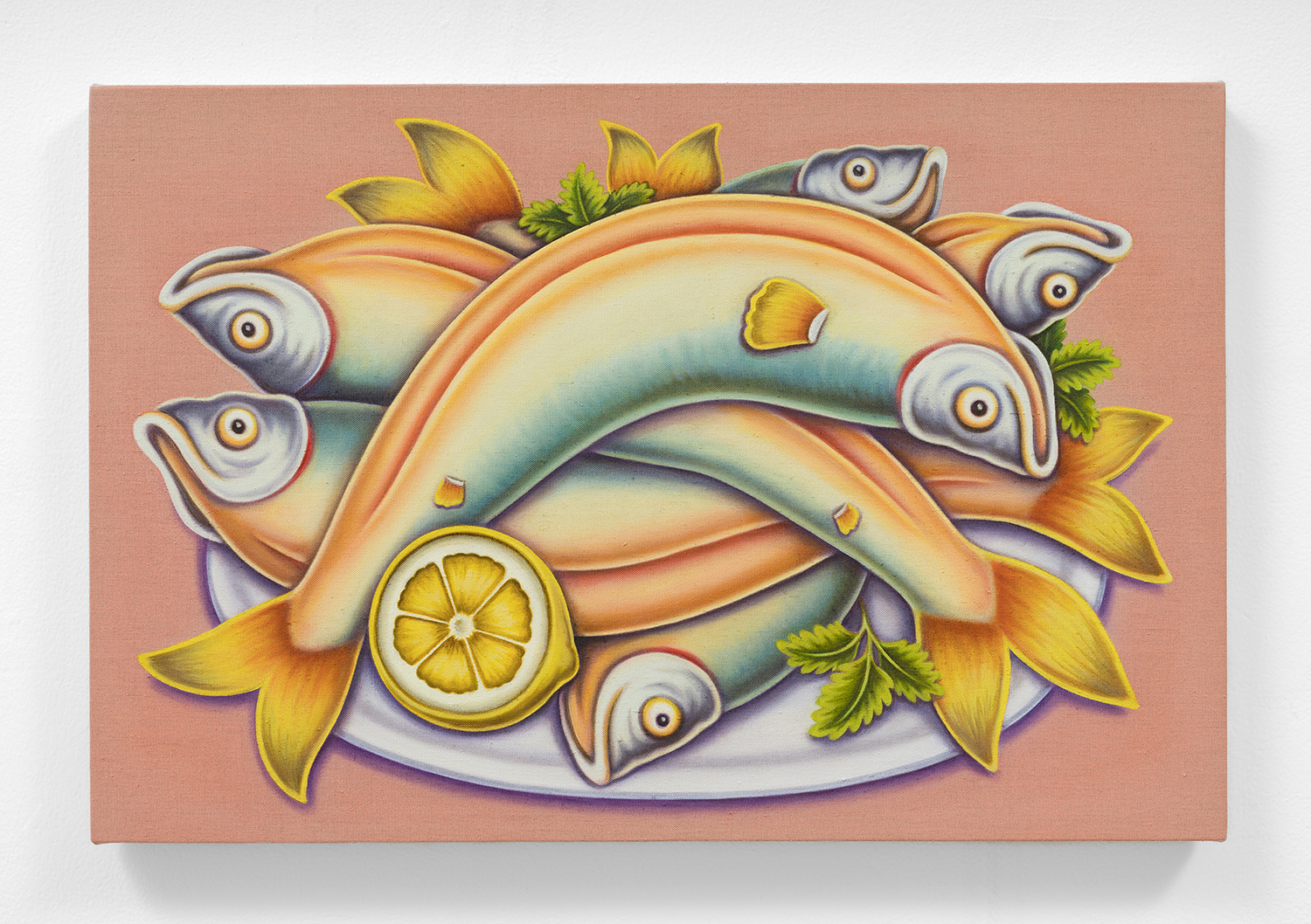 Pedro Pedro, Plate with Fish, 2023, Textile paint on linen, 20 x 30 inches, 51 x 76 cm.