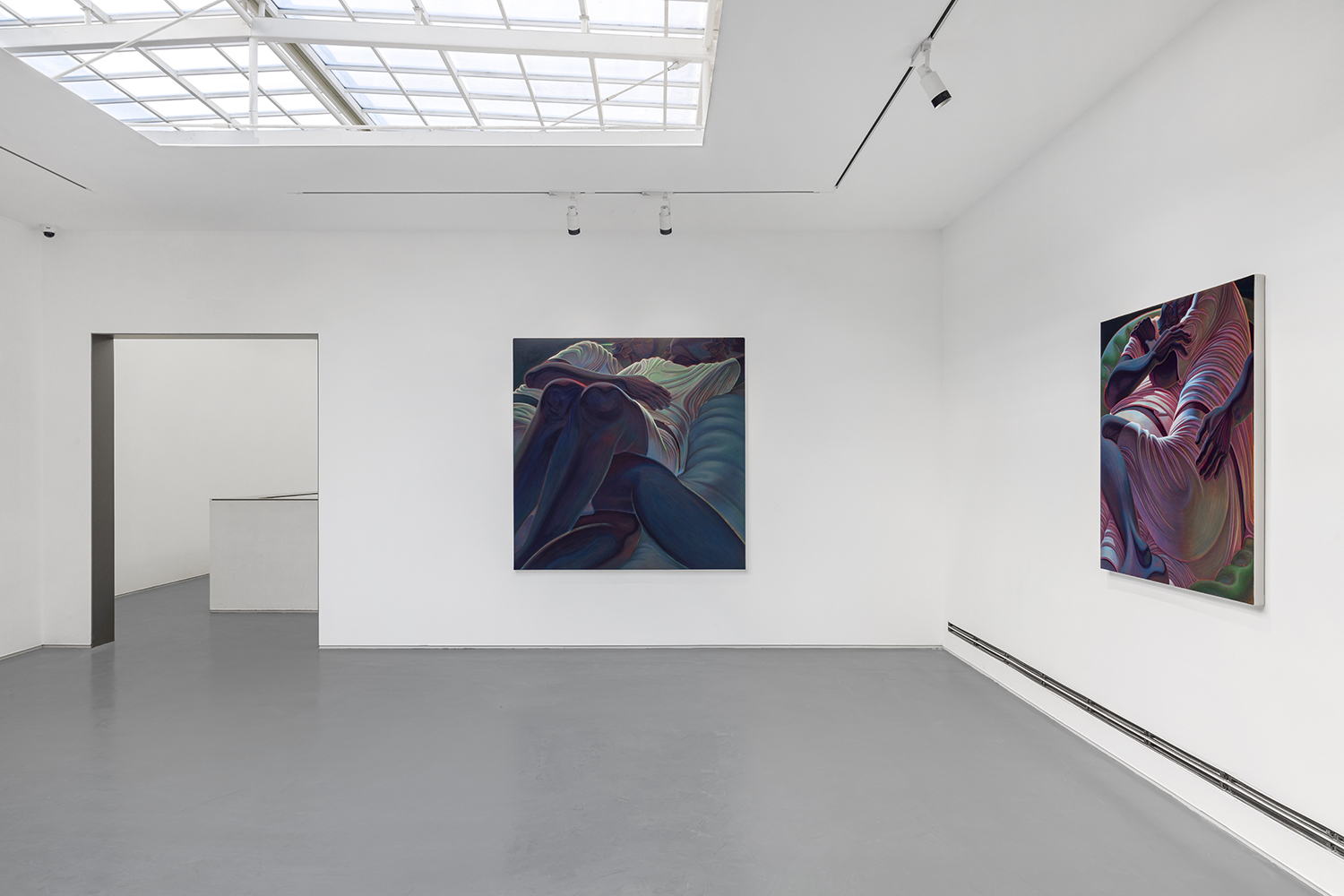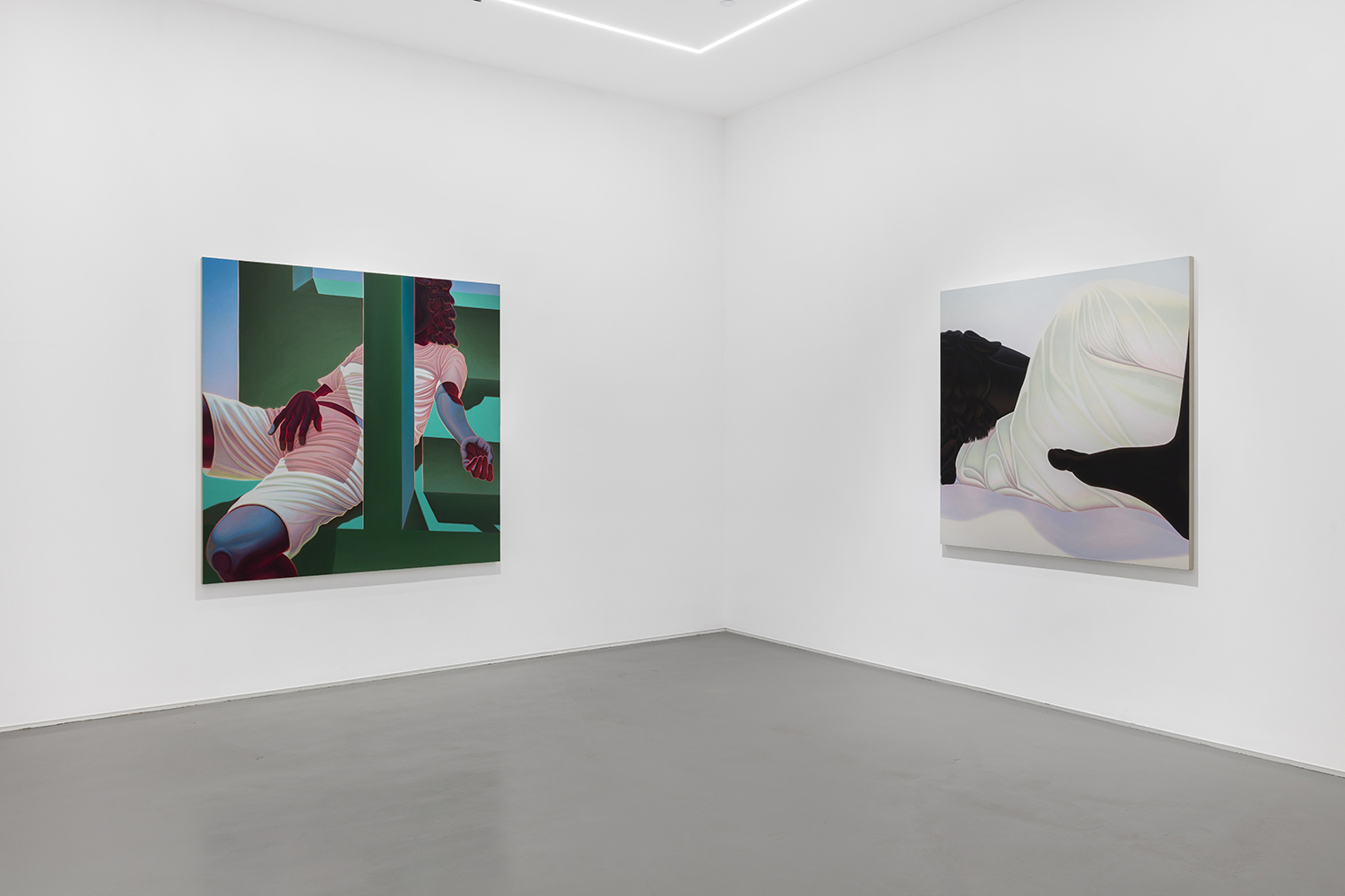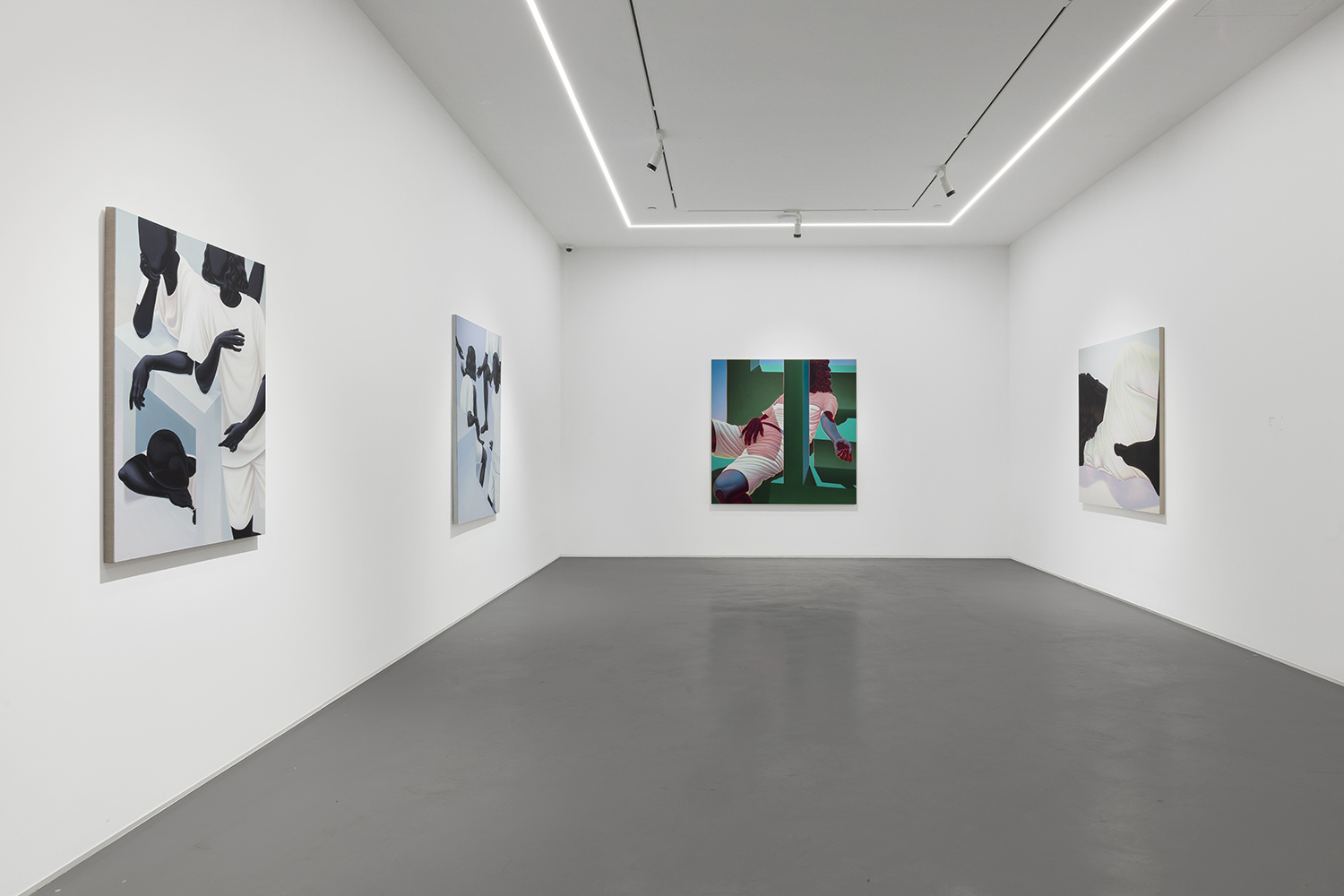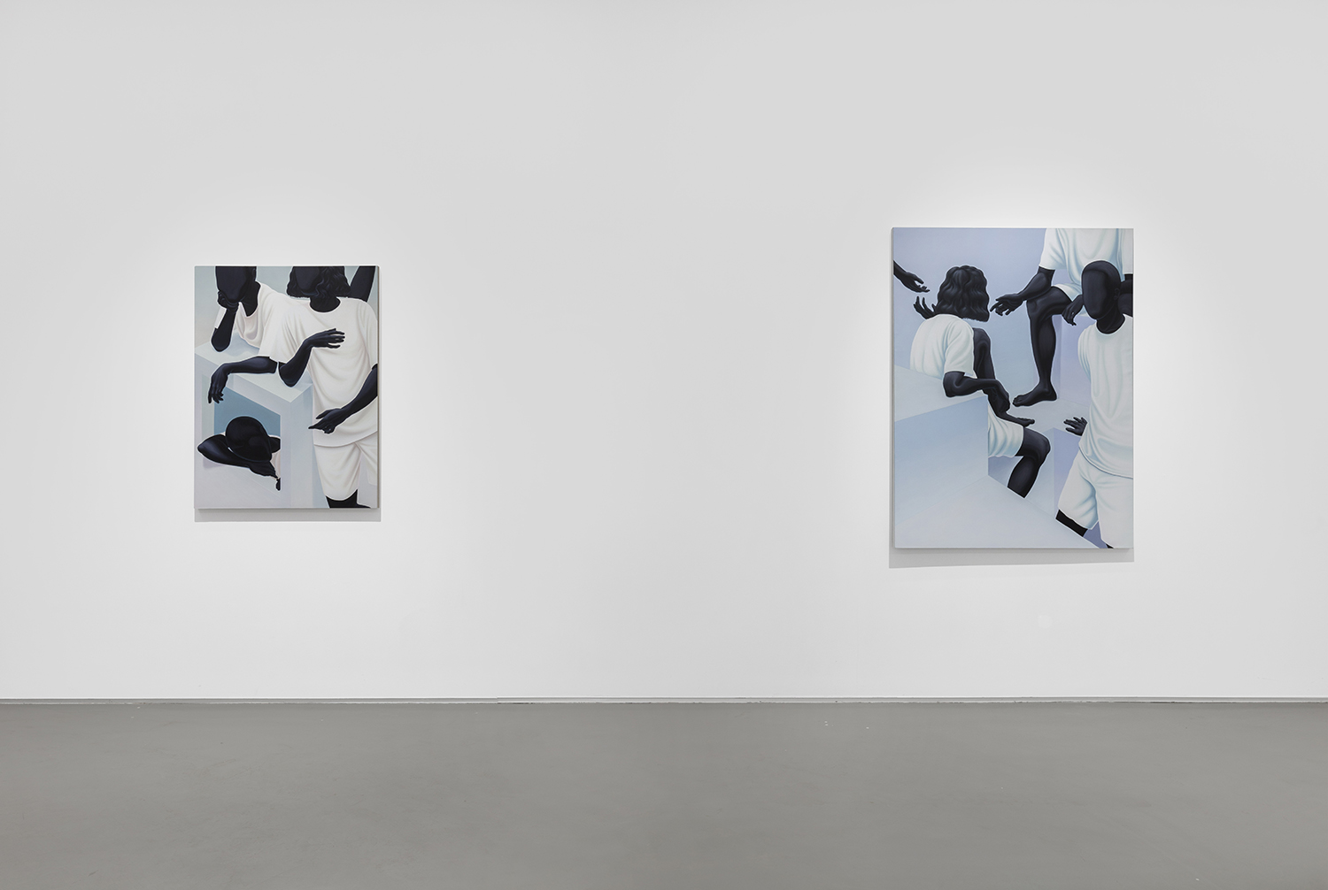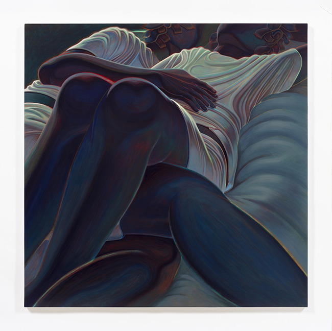 Alex Gardner is a figure painter working in acrylic to make intense and memorable scenes. His entangled ink-black bodies are draped with dramatically folding white cotton separates and posed in pastel environments where the reflections of color produce subtle gradients and thoughtful tonal shifts.