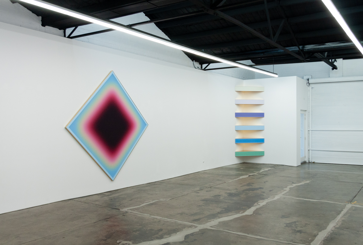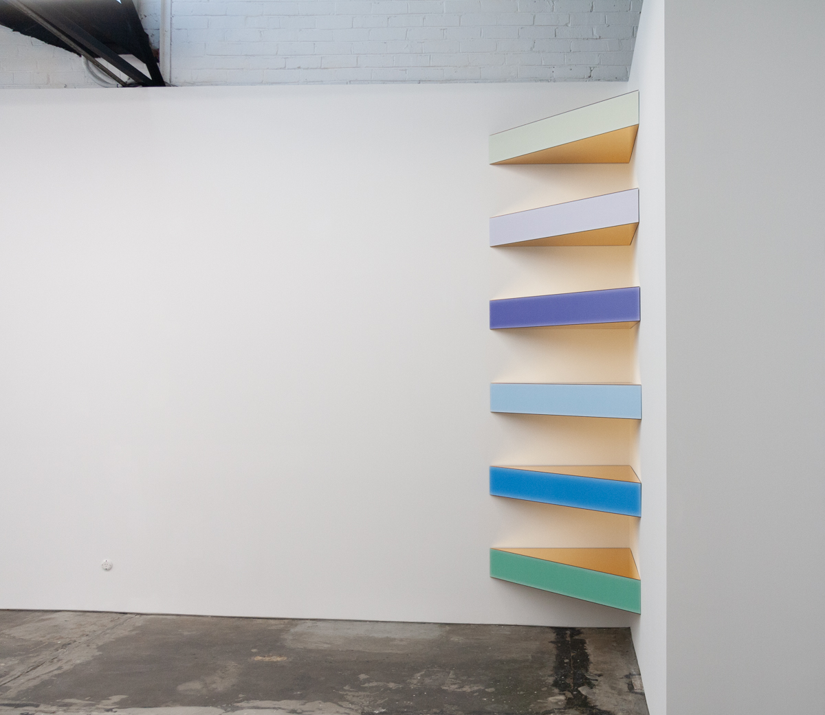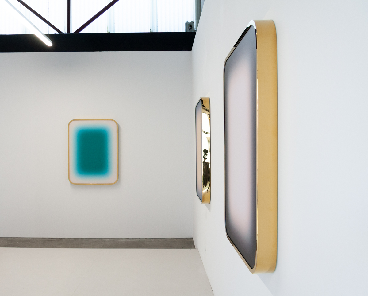 The gallery's front space sees a group of four large-scale works of multi-layered voile set in polished brass, this group of diamonds are created in vibrant colours merging and morphing into one another within each picture, a combination that reveals the familiar Nieschian effects of shimmer and moiré. This prismatic grotto is extended with a corner work representing a complex architecture of light, its angles reference the Donald Judd stack while firmly situated in a Euro discothèque, projections of softened pantone tones stagger between reflecting gold mirrors.
