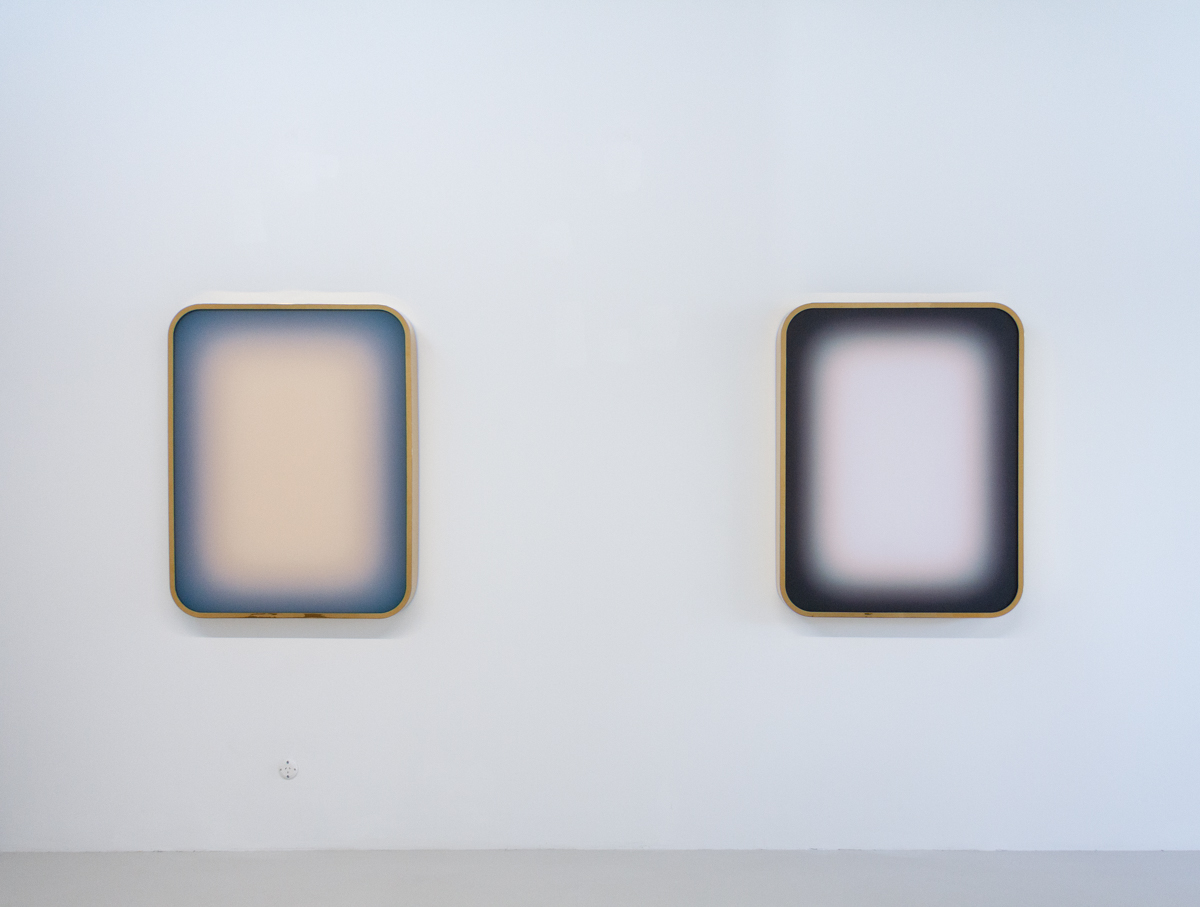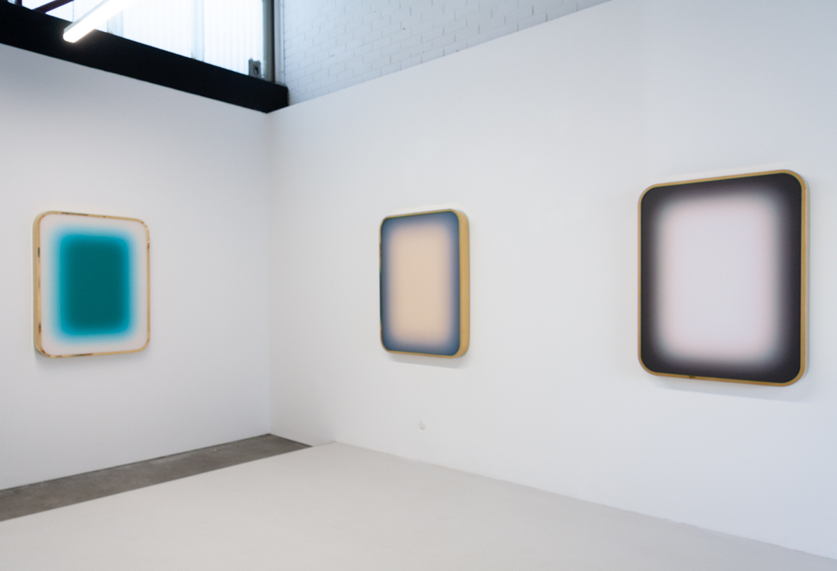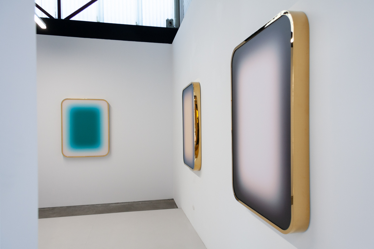 In the gallery’s viewing room a trio of lightboxes broadcast their energy analogously to the paintings in voile, even coupled with the reflective frame, yet these are but another example of how Niesche’s precise practice allows for a great deal of diversion. These lightboxes, a new venture, perhaps also talk to the show’s title, Atoms Encode, in the most literal way: “Atoms are not just matter, they also continuously transmit, encode and store information: the medium of such a pancomputationalism (the idea that everything computes) would be light.”