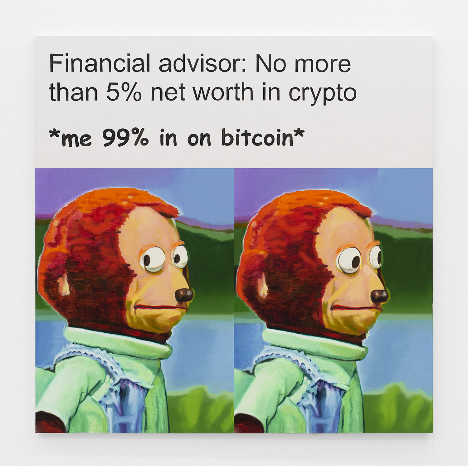 "Exhibiting at The Hole in New York, Wang recreates, or “re-deploys,” as Schachter proposed, a series of popular memes that confront the bizarre and inherently comical nature of cryptocurrencies.