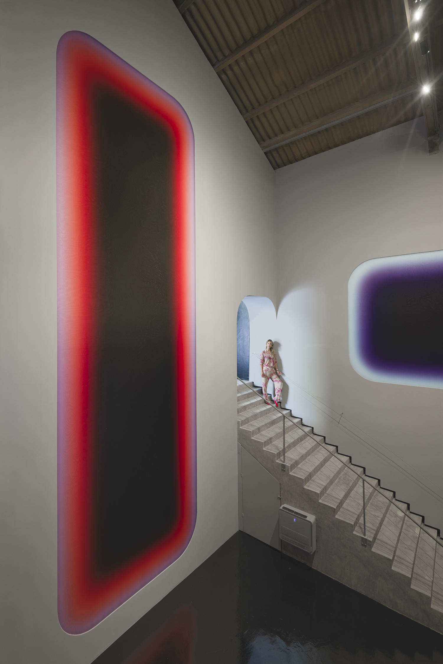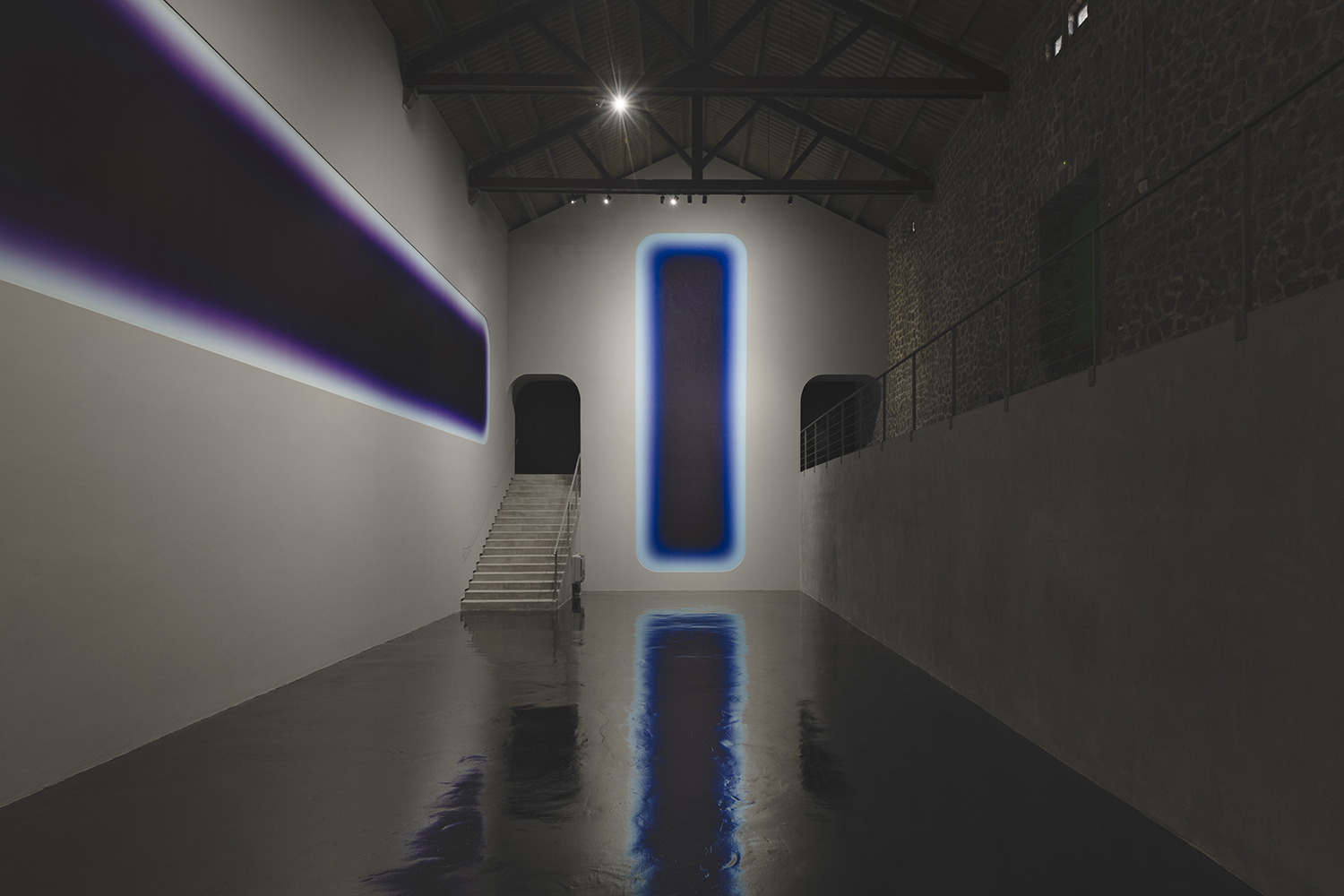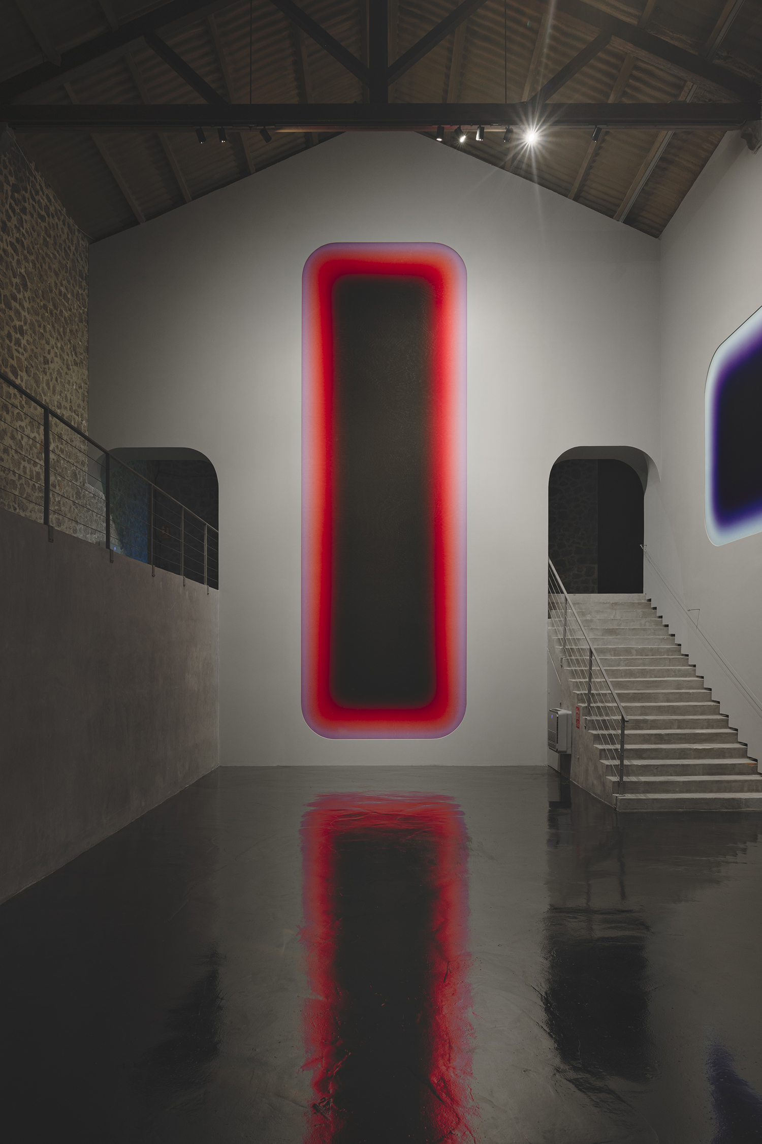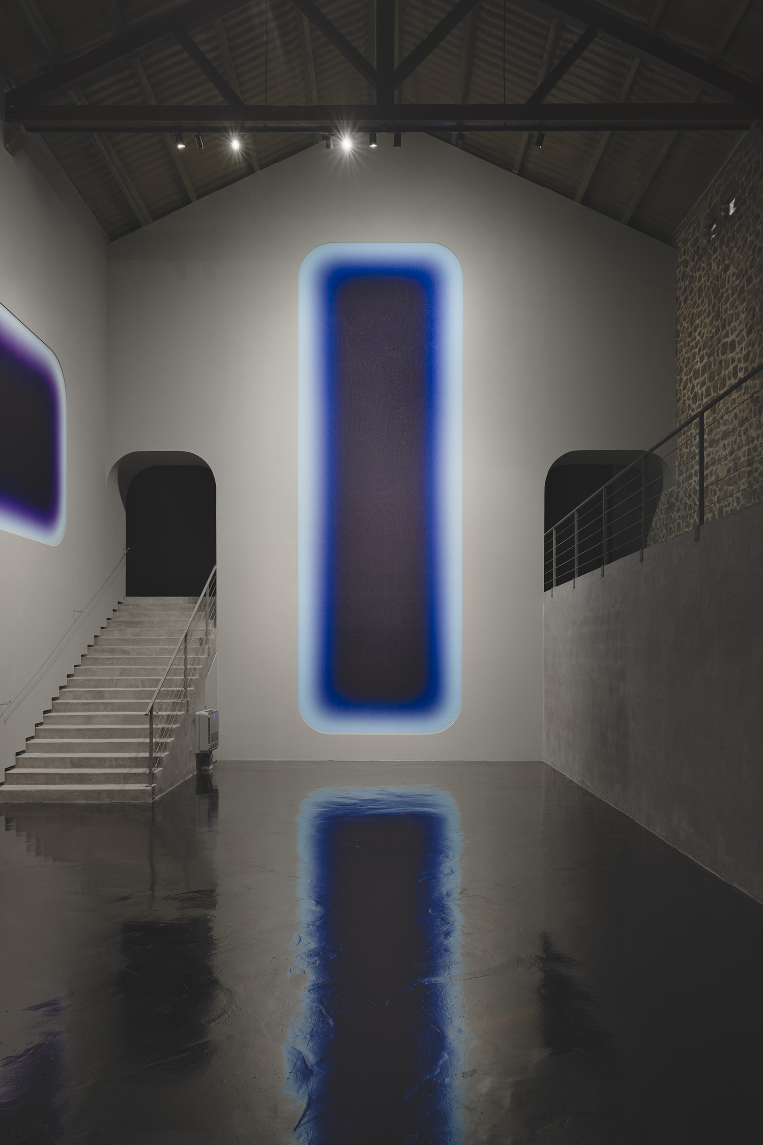 Niesche's three monumental works at La Nave are accompanied by the sound of a black hole at the center of the Perseus galaxy. The recording, captured by NASA last year, has been flattened and stretched for this occasion to exist in harmony with Niesche's exhibition.