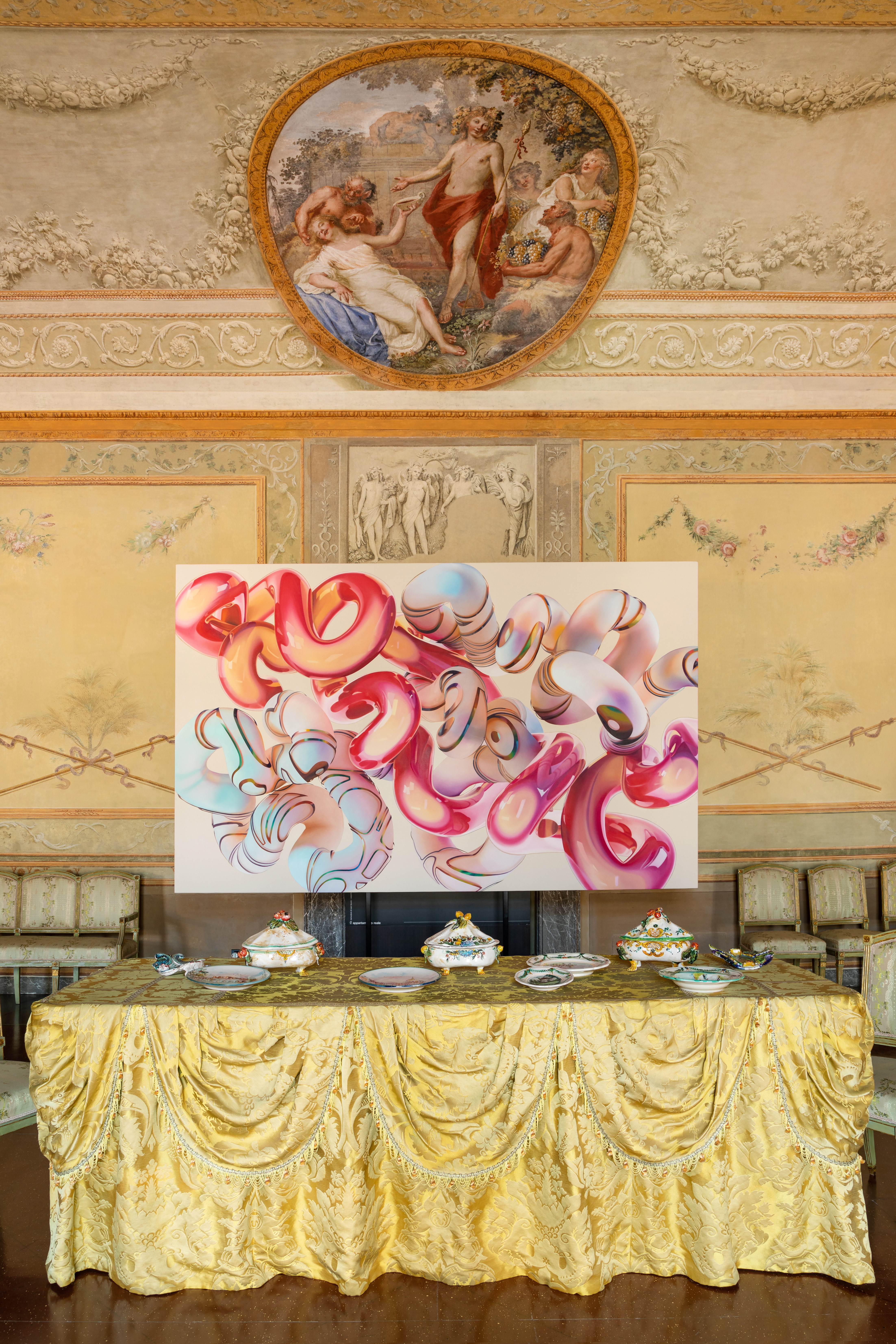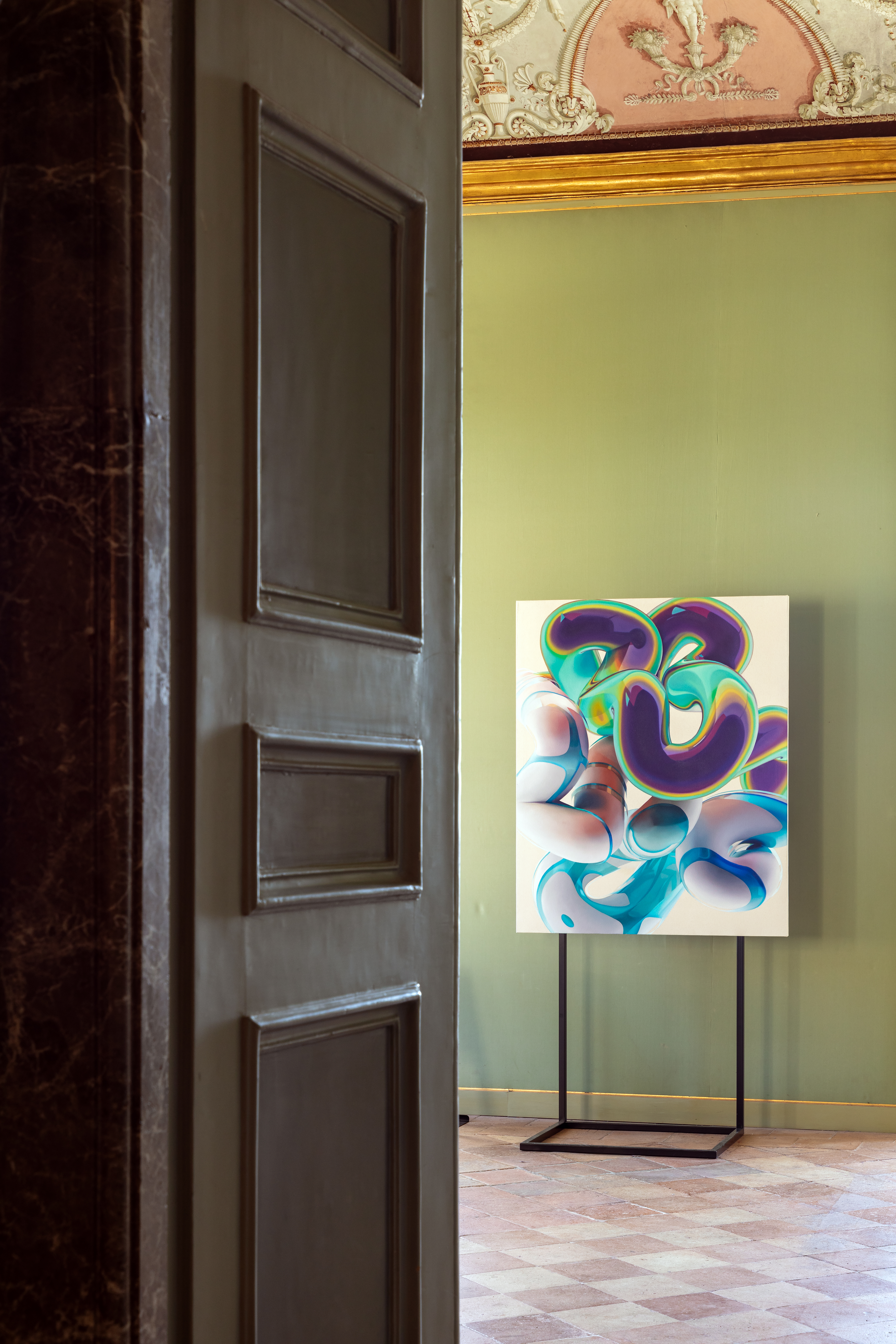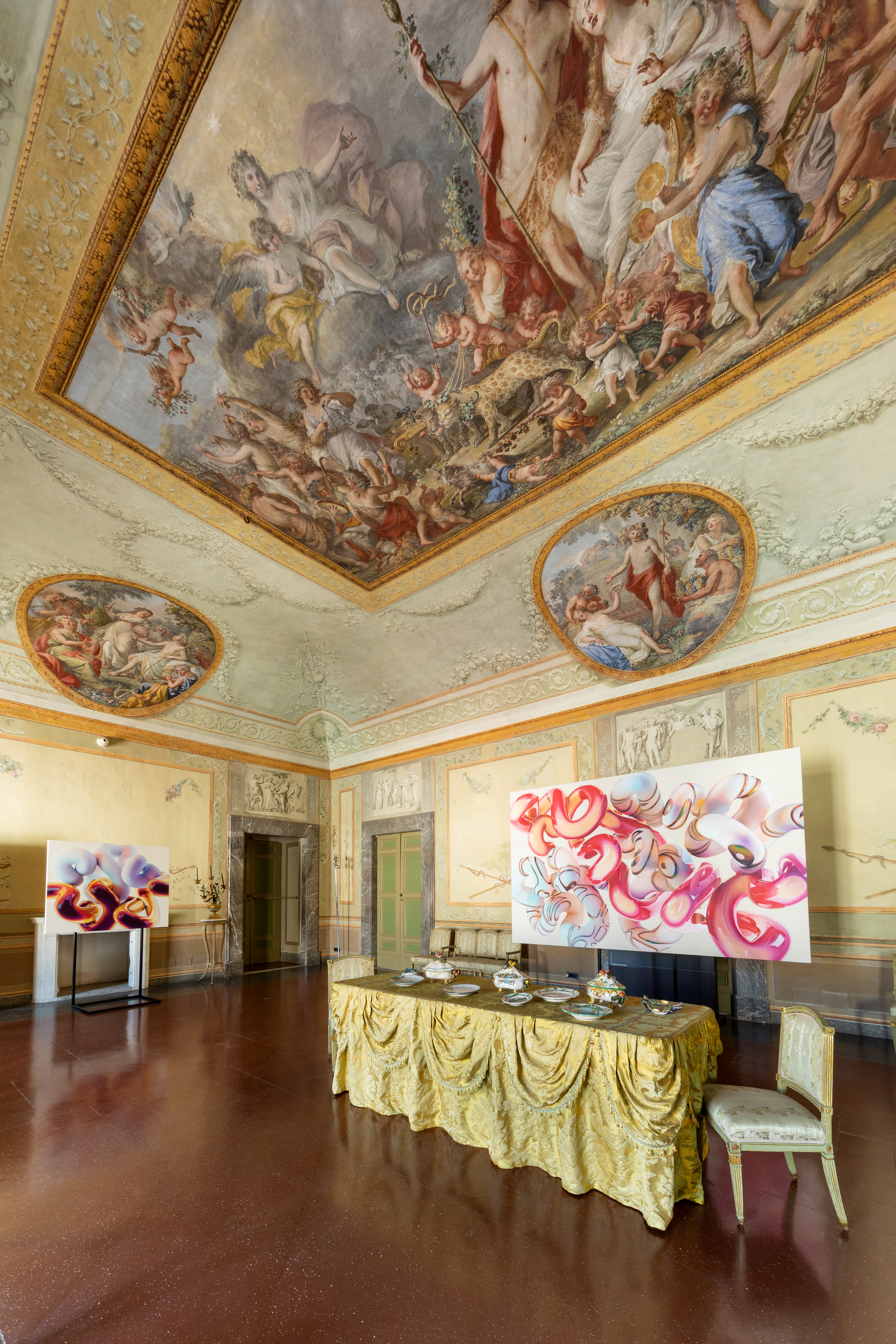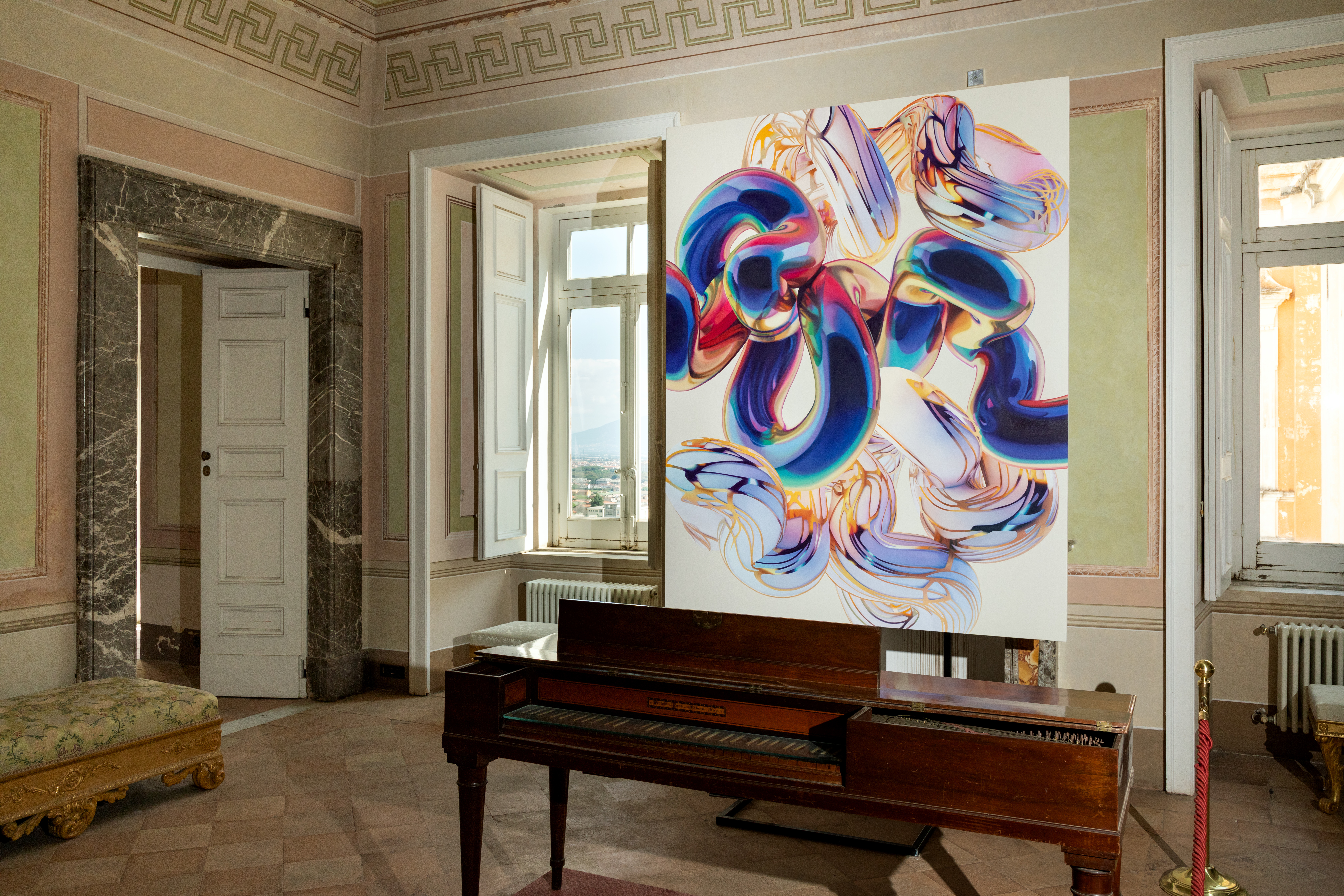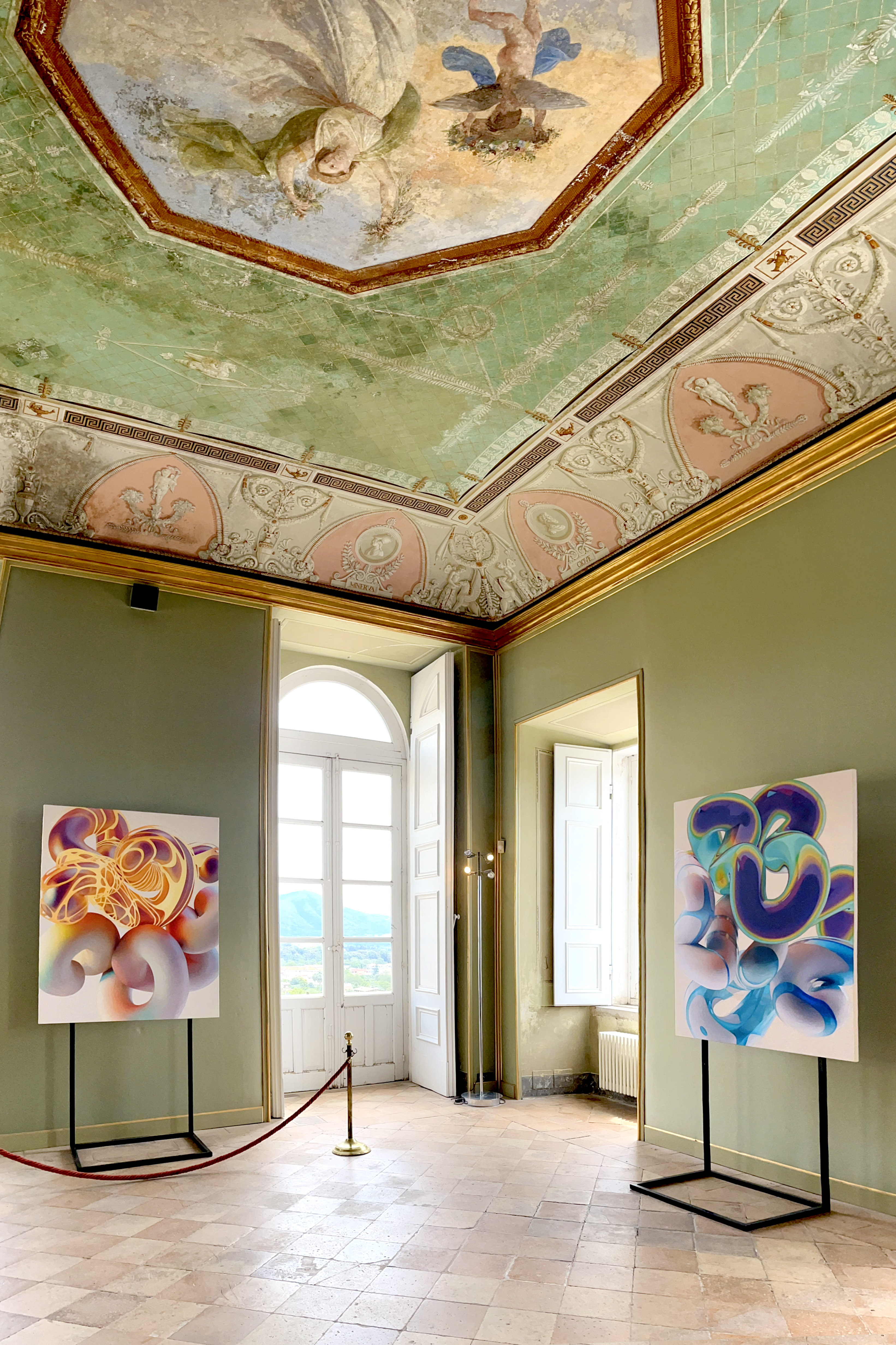 In her first ever institutional solo show, Vickie Vainionpää collaborates with Galleria Nicola Pedana to bring her Gaze series to the Real Belvedere di San Leucio. The works in this exhibition reference Ovid’s “Metamorphoses.” They specifically invoke the “Triumph of Bacchus and Ariadne” in response to a scene from the same poem painted in fresco by Italian Neoclassical painter Fedele Fischetti on the ceiling of the Grand Dining Room at the Belvedere di San Leucio. When titling this show Vickie references both the “translative processes” used in her work along with the “ever-evolving relationship painting has shared with the technologies of its time. In order to create this “post-digital reimagining of Fischetti” she uses “eye-tracking software to directly translate her own gaze of this work into visualised Bézier curves and stylised spines” she draws on “the act of gazing itself, through technological allowance [which] functions here as a conduit of interpretation and transformation.” In her practice, Vickie considers the impact of technology on the process of painting and investigates the relationship between natural forces and digital processes. By embracing new digital means of reading space and content, the works draw attention to the ever-changing relationship between the human body and digital technology.